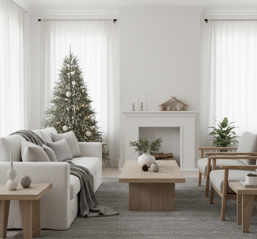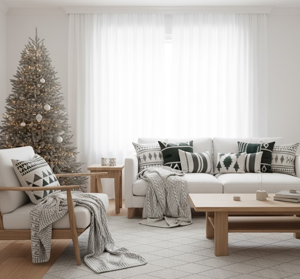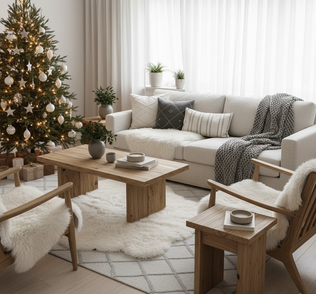 The Scandi boho festive look beautifully marries the clean lines of Scandinavian design with the relaxed charm of bohemian aesthetics. This style features light wood furniture, simple geometric patterns, and natural textures like wool and linen, softened by cosy throws and subtle festive greenery. The colour palette is predominantly white, grey, and natural wood, with occasional accents of deep forest green or muted berry tones. The mood is calm, bright, and effortlessly stylish, creating a serene yet inviting atmosphere. Functionally, it promotes an uncluttered and harmonious space, perfect for a peaceful holiday season.