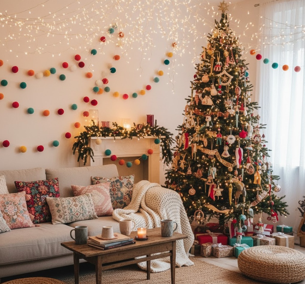Embrace the warmth of a rustic bohemian Christmas with natural elements and handcrafted touches. This style features chunky knit throws, wooden ornaments, and dried floral arrangements that bring an organic, earthy feel to your festive space. The colour palette leans towards rich, muted tones like terracotta, sage green, and creamy off-whites, creating a profoundly cosy and inviting atmosphere. Functionality is paramount, with comfortable seating and soft, ambient lighting encouraging relaxation and intimate gatherings. This aesthetic perfectly blends country charm with free-spirited bohemian flair, making your home feel truly special and grounded for the holidays.
