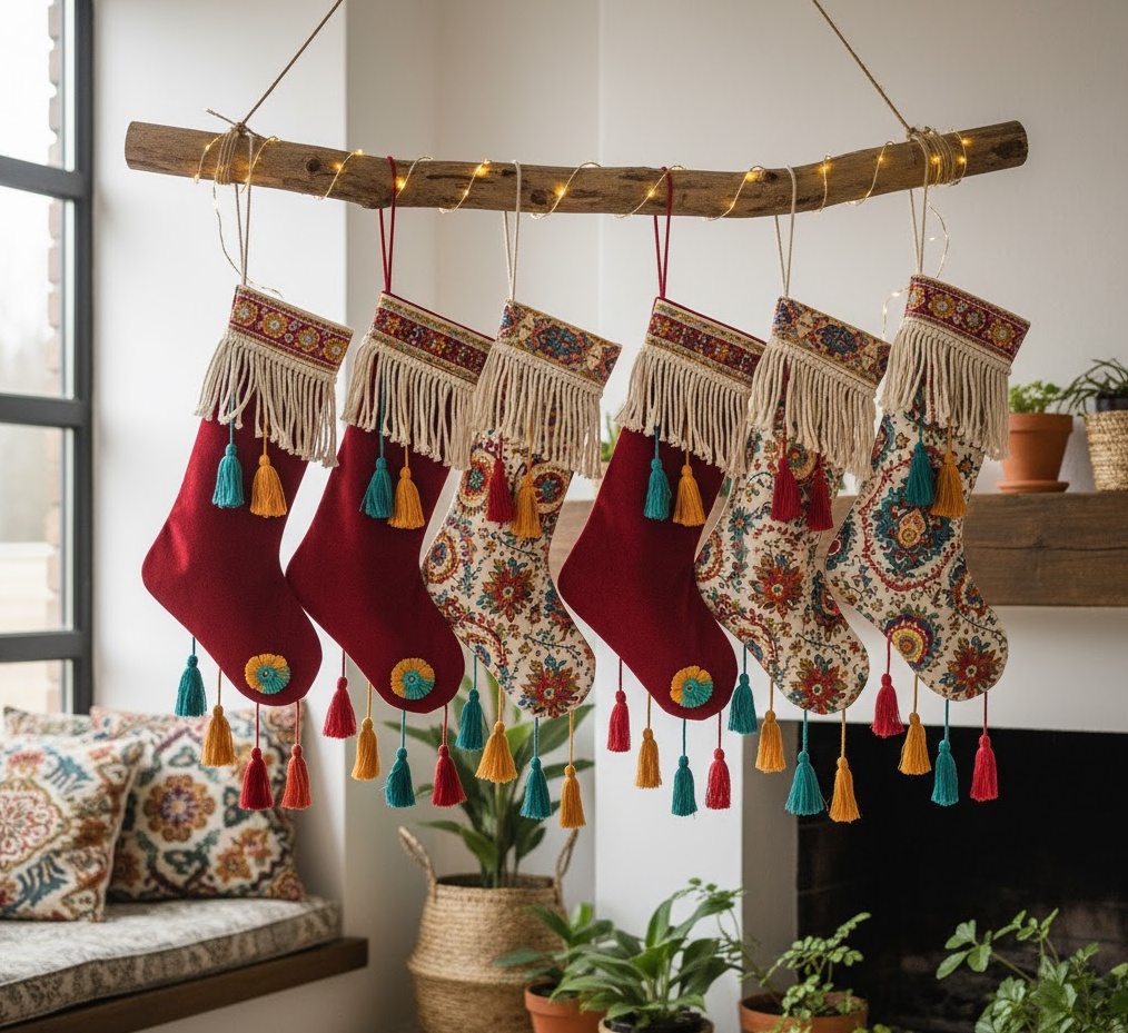 Infuse your holiday home with free-spirited charm using bohemian festive socks decor, a vibrant and eclectic Christmas socks decoration style. This look embraces rich textures, global patterns, and a mix of colours, often featuring stockings in deep jewel tones like ruby red, sapphire blue, and amethyst purple, alongside earthy browns and creams. Materials include macramé, embroidered fabrics, velvet, and patterned textiles, adorned with tassels, fringe, beads, and small mirrors. The mood is artistic, cosy, and wonderfully unconventional, perfect for a creative living space or a vibrant, eclectic interior. Functionally, these unique stockings add a burst of personality and warmth, creating a visually rich and inviting display that celebrates individuality and global inspiration during the festive season.