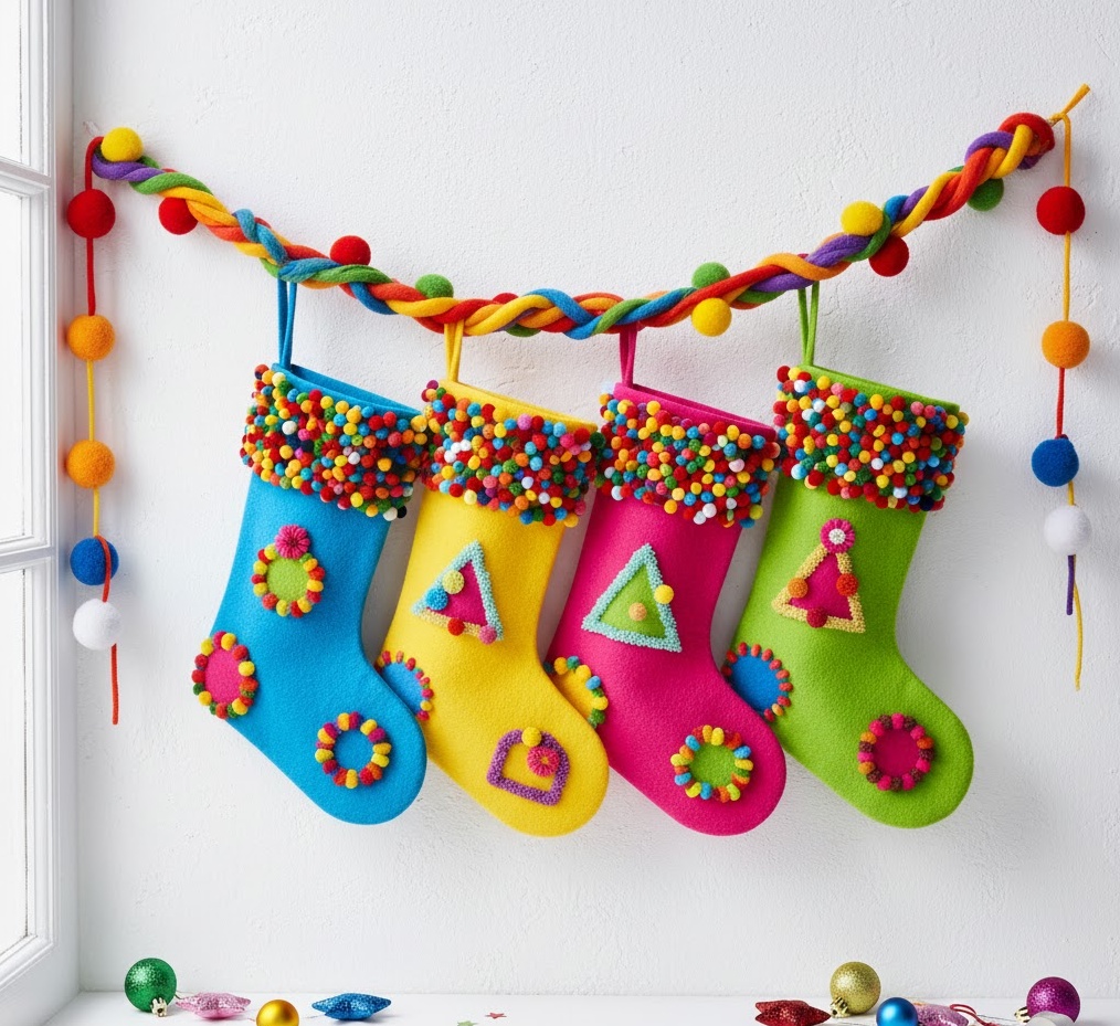 Inject a burst of energy and cheer into your home with bright colourful stocking ideas, a playful and vibrant Christmas socks decoration approach. This style embraces a joyful spectrum of hues, featuring stockings in bold primary colours like electric blue, sunny yellow, fuchsia pink, and lime green, often mixed and matched for an eclectic look. Materials can range from felt and cotton to bright knits, adorned with pom-poms, glitter, or quirky patterns. The mood is exuberant, fun, and wonderfully festive, perfect for a modern family home, a child’s play area, or any space that thrives on vibrant personality. Functionally, these lively stockings serve as cheerful receptacles for gifts, creating an eye-catching and uplifting display that radiates happiness and youthful spirit throughout the holiday season.