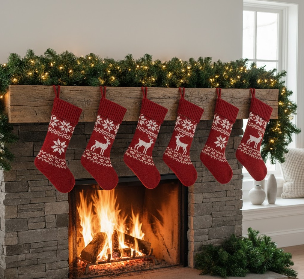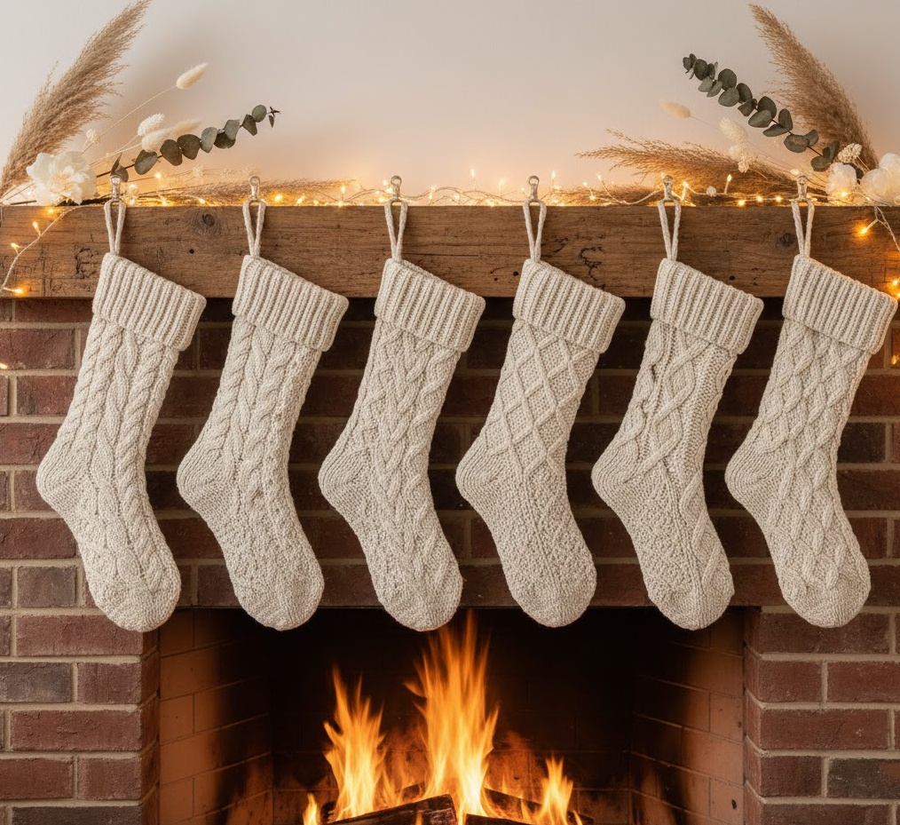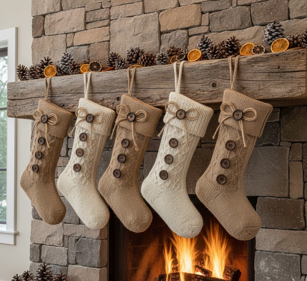 Embrace the charm of the countryside with rustic farmhouse stocking decor, a style that champions natural textures and a homely, unpretentious feel. This Christmas socks decoration trend features stockings crafted from burlap, linen, or chunky wool, often in muted tones of cream, beige, and forest green, perhaps with subtle plaid or gingham accents. The aesthetic is warm, inviting, and effortlessly chic, perfect for a farmhouse kitchen or a cosy, open-plan living area. Functionally, these robust stockings are ideal for holding an abundance of festive treats, contributing to a relaxed, lived-in holiday atmosphere. Adornments might include wooden buttons, twine bows, sprigs of real pine, or personalised hand-stitched initials, creating a truly bespoke and heartwarming display that celebrates simplicity and natural beauty.
