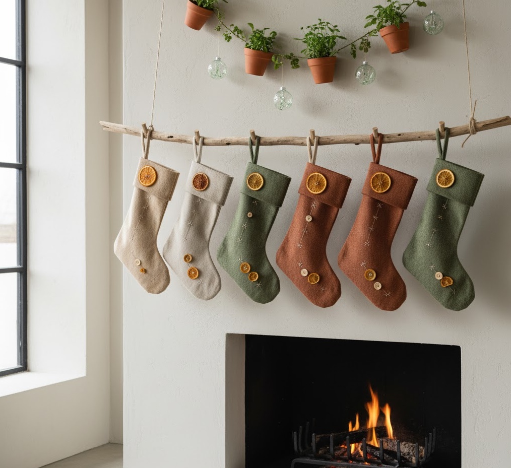 Celebrate the festive season sustainably with eco friendly Christmas socks, a thoughtful and conscious Christmas socks decoration choice. This style prioritises natural, recycled, or upcycled materials, featuring stockings made from organic cotton, recycled wool, repurposed burlap, or even vintage fabrics. Colours tend to be earthy and muted, such as natural linen, sage green, terracotta, or undyed wool, often with simple, handcrafted embellishments like dried botanicals, wooden buttons, or hand-stitched details. The mood is mindful, authentic, and grounded, perfect for a home that values sustainability and natural aesthetics. Functionally, these environmentally conscious stockings not only hold gifts but also serve as a beautiful statement of your commitment to a greener Christmas, adding a unique, rustic charm to your interior.
