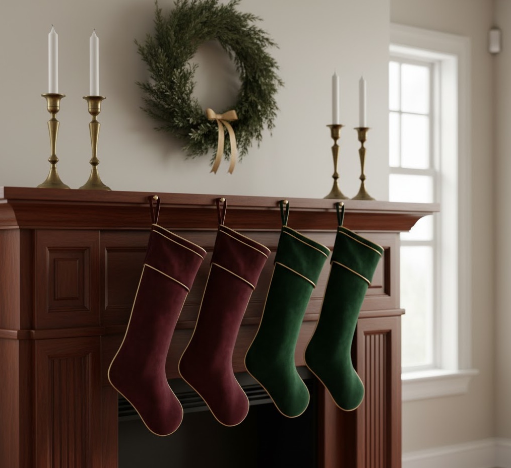 Elevate your holiday decor with the luxurious touch of elegant velvet Christmas socks, a sophisticated choice for a refined interior. This Christmas socks decoration style focuses on the rich texture and deep hues of velvet, often in jewel tones like deep burgundy, forest green, sapphire blue, or even sophisticated charcoal. The stockings are typically unadorned or feature minimal embellishments such as subtle gold piping, a single pearl, or a delicate monogram, allowing the fabric’s inherent beauty to shine. The mood is opulent, refined, and incredibly chic, ideal for a formal living room, a grand hallway, or a master bedroom. Functionally, these plush stockings add a tactile warmth and visual depth to your display, creating a sense of understated luxury that is both inviting and impressive.