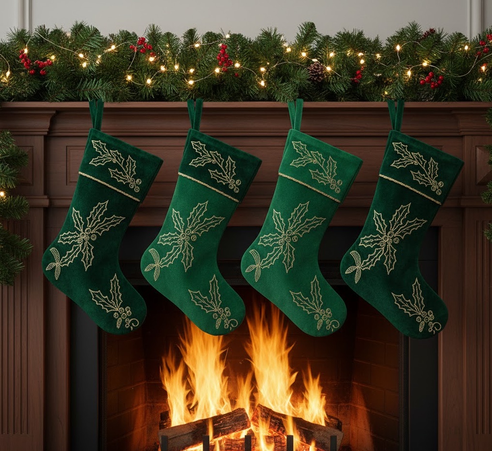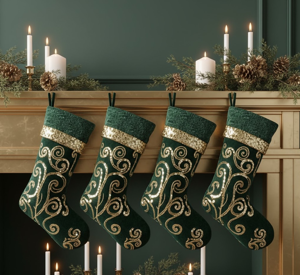 Revisit the enduring charm of classic holiday aesthetics with traditional green Christmas socks, a beloved Christmas socks decoration choice. This style focuses on the rich, deep hues of forest green, often paired with complementary reds, golds, or creams, evoking the natural beauty of evergreen trees. Stockings are typically made from plush felt, soft velvet, or knitted wool, adorned with classic motifs like holly, pinecones, or simple gold embroidery. The mood is warm, inviting, and deeply rooted in festive tradition, perfect for a classic living room, a cosy study, or a dining area where family gathers. Functionally, these elegant stockings serve as beautiful receptacles for gifts, while visually harmonising with natural garlands and wreaths, creating a cohesive and timeless holiday display that feels both grand and comforting.