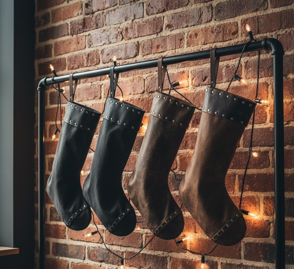 For a truly distinctive holiday statement, consider an industrial loft stocking design, a bold and edgy Christmas socks decoration approach. This style features stockings crafted from unexpected materials like distressed leather, heavy canvas, or dark denim, often in a muted palette of charcoal, black, deep olive, and rust. Embellishments are minimal and utilitarian, such as metal rivets, exposed stitching, or sturdy buckles, reflecting the raw aesthetic of industrial design. The mood is urban, sophisticated, and effortlessly cool, perfect for a city loft, a converted warehouse, or a contemporary space with exposed brickwork. Functionally, these robust stockings add a unique, masculine touch to your festive display, providing a striking contrast to traditional holiday decor and celebrating a modern, unconventional aesthetic.