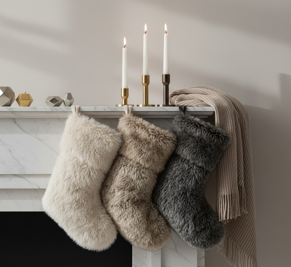 Indulge in ultimate comfort and sophistication with a luxury faux fur socks display, a sumptuously soft Christmas socks decoration choice. This style features stockings crafted entirely from high-quality faux fur, in rich, natural tones like creamy ivory, deep charcoal, or warm taupe, mimicking the look and feel of real fur without ethical concerns. The texture itself is the primary embellishment, creating a lavish and inviting aesthetic. The mood is opulent, incredibly cosy, and undeniably glamorous, perfect for a chic living room, a luxurious bedroom, or a contemporary space seeking a touch of tactile warmth. Functionally, these plush stockings add an unparalleled sense of softness and depth to your festive display, creating a visually stunning and inviting focal point that exudes high-end comfort.