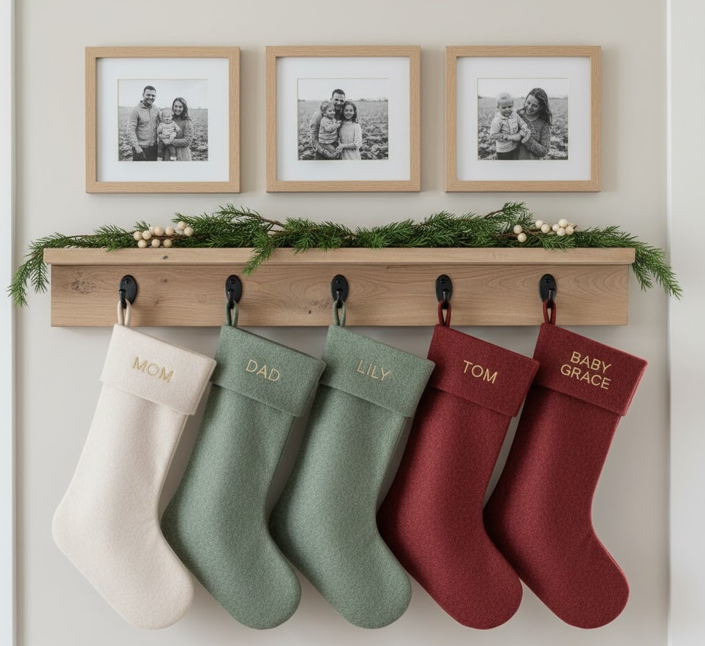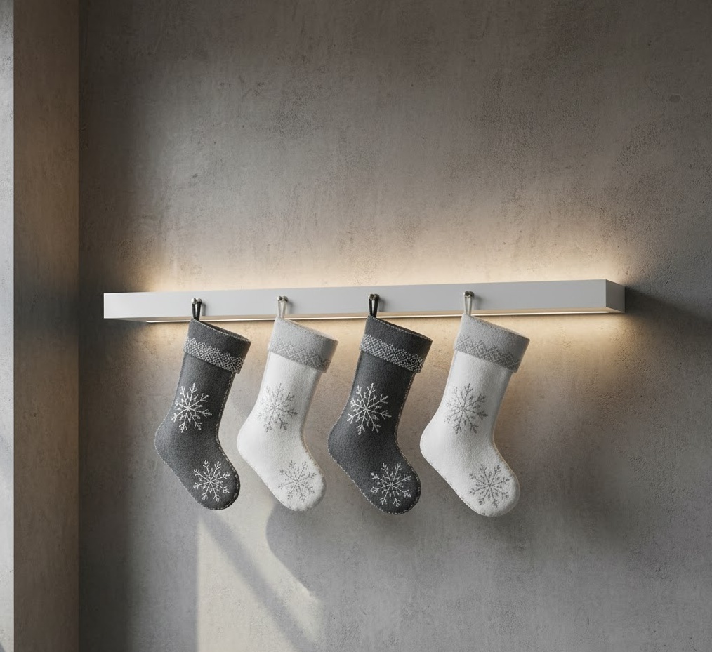 For those who favour clean lines and understated elegance, the modern minimalist sock display offers a sophisticated take on Christmas socks decoration. This style focuses on simplicity, featuring stockings in monochromatic palettes such as crisp white, charcoal grey, or deep navy, often with subtle metallic accents in silver or matte gold. Materials are typically sleek and refined, like smooth felt, fine knit, or even faux leather, devoid of excessive embellishment. The mood is calm, contemporary, and uncluttered, perfectly complementing a modern urban apartment or a Scandinavian-inspired interior. Functionally, these streamlined stockings provide a chic vessel for gifts without overwhelming the space, maintaining a sense of serene order amidst the festive cheer. Their beauty lies in their refined simplicity and thoughtful placement, creating a sophisticated holiday statement.