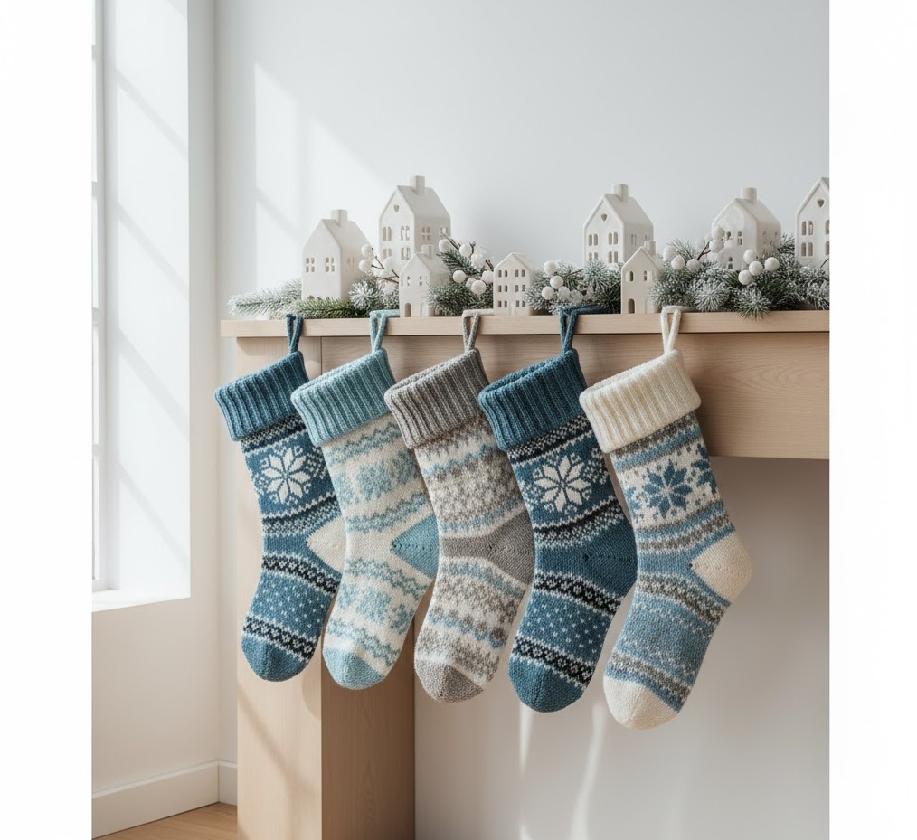 Embrace the crisp, cool beauty of the Nordic winter with this enchanting Christmas socks decoration theme. This style draws inspiration from Scandinavian landscapes, featuring stockings in a palette of icy blues, crisp whites, silver greys, and natural wood tones. Materials often include chunky wool knits, soft faux fur, and felt, adorned with simple, geometric patterns, snowflakes, or stylised reindeer motifs. The mood is serene, fresh, and elegantly minimalist, perfect for creating a tranquil holiday atmosphere in a contemporary or modern rustic interior. Functionally, these beautiful stockings add a touch of winter wonderland charm, providing a soft, textural element that enhances the overall feeling of a peaceful, snow-kissed festive season. They are ideal for a clean, uncluttered aesthetic.