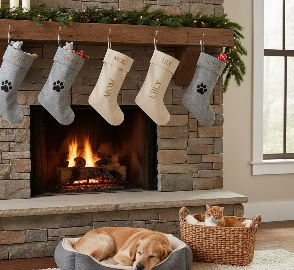 Include your beloved furry friends in the festive fun with pet friendly stocking decoration, a heartwarming Christmas socks decoration idea. This style features stockings specifically designed for pets, often in durable materials like canvas, felt, or sturdy knit, in colours that complement your existing decor, such as paw print patterns or bone motifs. Each stocking can be personalised with your pet’s name, a paw print, or a cute animal silhouette. The mood is joyful, inclusive, and utterly charming, perfect for a family home where pets are cherished members. Functionally, these special stockings are ideal for holding pet treats, toys, and small gifts, ensuring that every member of the household, two-legged or four-legged, has their own special place in the Christmas celebrations, adding a delightful touch to your interior.
