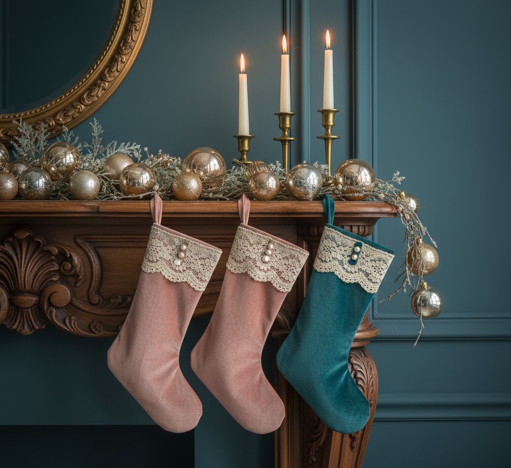 Step back in time with vintage inspired stocking decor, a charming Christmas socks decoration style that evokes nostalgia and old-world elegance. This aesthetic often features stockings made from antique-looking fabrics like aged linen, faded velvet, or patterned brocade, in muted, sophisticated colours such as dusty rose, deep teal, or tarnished gold. Embellishments might include delicate lace trim, pearl buttons, intricate beadwork, or small, tarnished metallic charms. The mood is romantic, elegant, and full of historical charm, perfect for a period property or a home with a curated, eclectic style. Functionally, these beautiful stockings serve as exquisite decorative pieces, adding character and a sense of timeless beauty to your festive display, reminiscent of Christmases past.