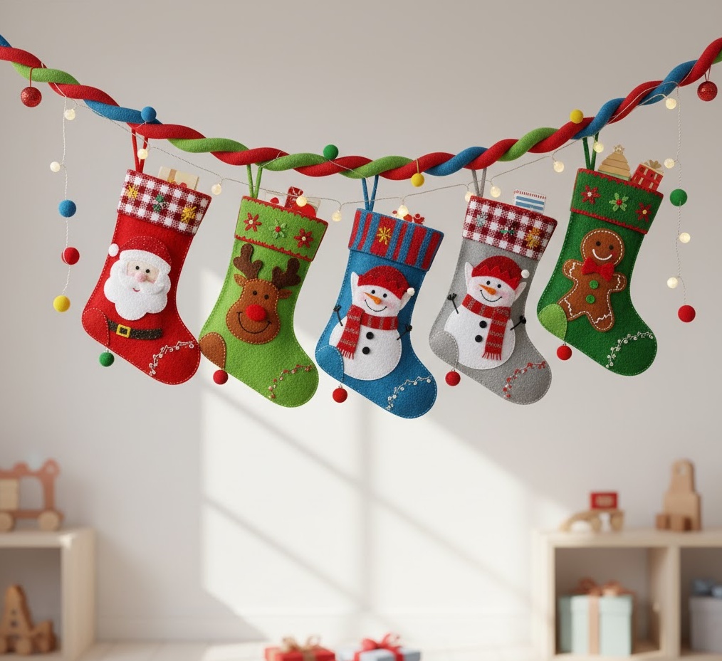 Create a magical and playful atmosphere with whimsical kids stocking ideas, designed to delight the younger members of the family. This Christmas socks decoration style features bright, cheerful colours like vibrant reds, greens, blues, and yellows, often adorned with fun, imaginative motifs. Think playful characters like Santa, elves, reindeers, or even favourite cartoon figures, crafted from soft felt, plush fabrics, or colourful knits. The mood is joyful, exciting, and full of childlike wonder, perfect for a family room, a child’s bedroom, or a dedicated play area. Functionally, these charming stockings are perfect for holding small toys, sweets, and personalised treats, making Christmas morning even more special. Their lively designs add a burst of energy and personality to your festive interior.