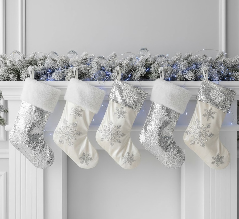 Transform your home into a serene, snow-kissed sanctuary with white winter wonderland stockings, a truly ethereal Christmas socks decoration style. This aesthetic embraces a pristine palette of pure white, ivory, and soft silver, creating a magical, frosty atmosphere. Stockings are crafted from luxurious materials like faux fur, delicate lace, shimmering satin, or chunky white knits, often adorned with iridescent sequins, silver beads, or delicate snowflake embellishments. The mood is elegant, dreamlike, and incredibly peaceful, perfect for a sophisticated living room, a chic bedroom, or any space where you desire a touch of frosty glamour. Functionally, these exquisite stockings add a light, airy feel to your festive display, reflecting ambient light and creating a breathtakingly beautiful and serene holiday scene.