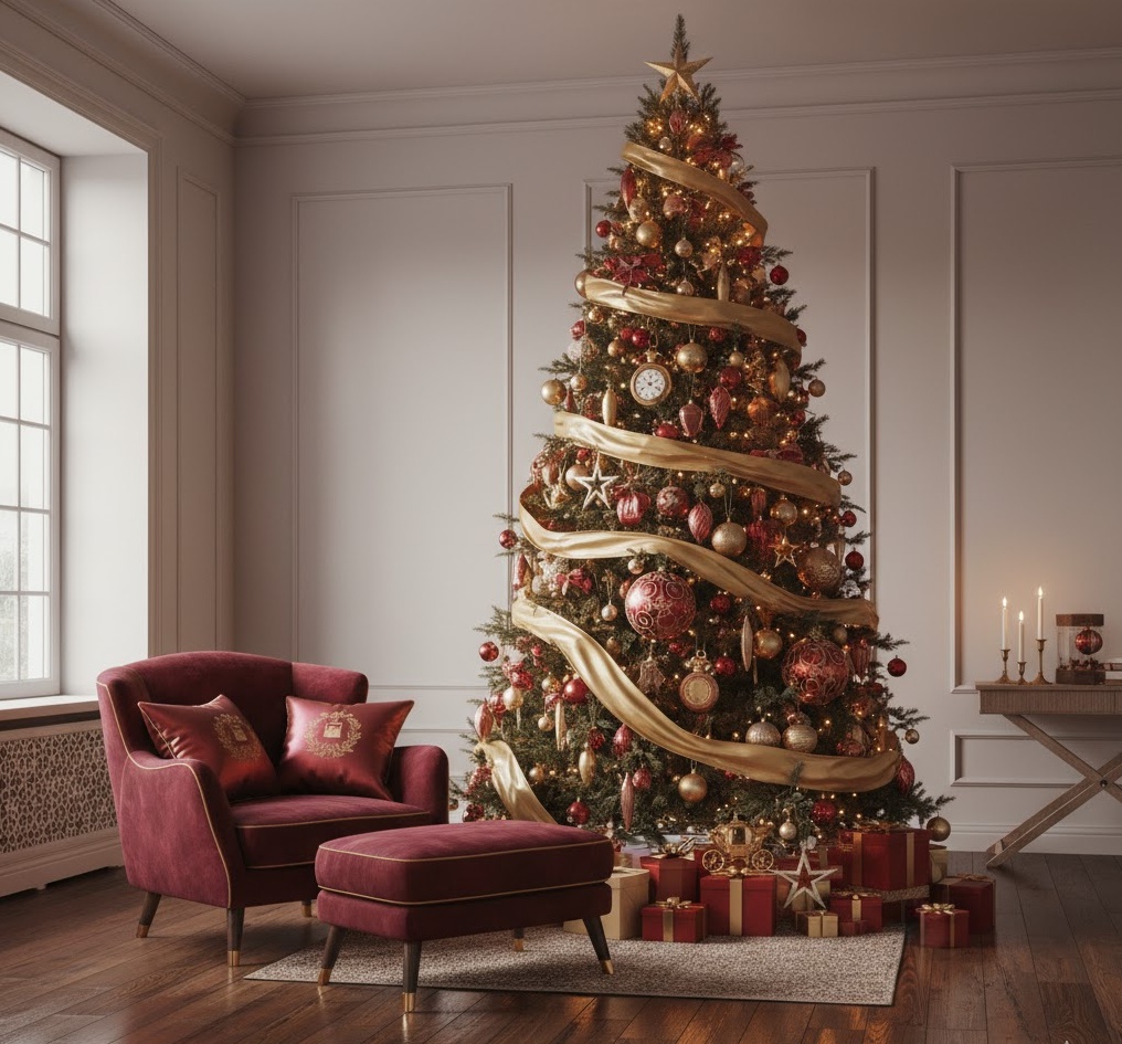 Embrace timeless elegance with classic red and gold christmas tree decorating, a beloved style that evokes warmth and tradition. This scheme typically features deep crimson baubles, rich gold ribbons, and perhaps some ornate, vintage-inspired ornaments. Materials often include velvet, satin, and metallic finishes, creating a luxurious yet inviting atmosphere. The mood is undeniably festive and grand, perfect for a traditional living room, offering a sense of nostalgic comfort and sophisticated charm. Functionally, this style provides a strong focal point, anchoring your holiday decor with its vibrant, celebratory colours and familiar aesthetic.