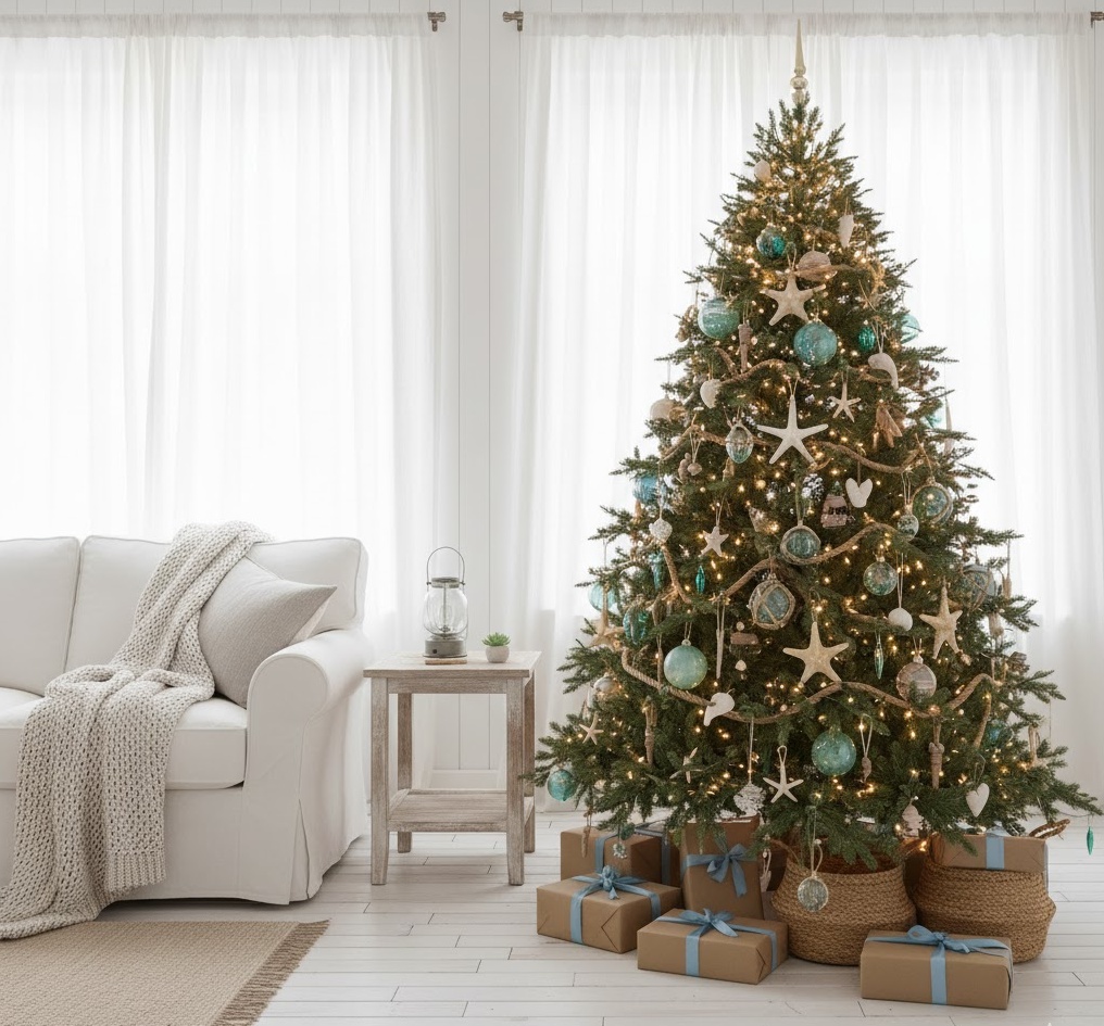 Bring the serene beauty of the seaside indoors with coastal beach christmas tree decorating. This refreshing style uses a palette of blues, greens, sandy beiges, and crisp whites, evoking ocean waves and sandy shores. Ornaments often include seashells, starfish, driftwood pieces, glass floats, and perhaps some netting or rope accents. Materials are natural and weathered, like bleached wood, jute, and frosted glass. The mood is calm, airy, and relaxed, perfect for homes by the sea or those longing for a tranquil escape. Functionally, it offers a unique, light-hearted take on festive decor, creating a refreshing and unexpected holiday vibe.