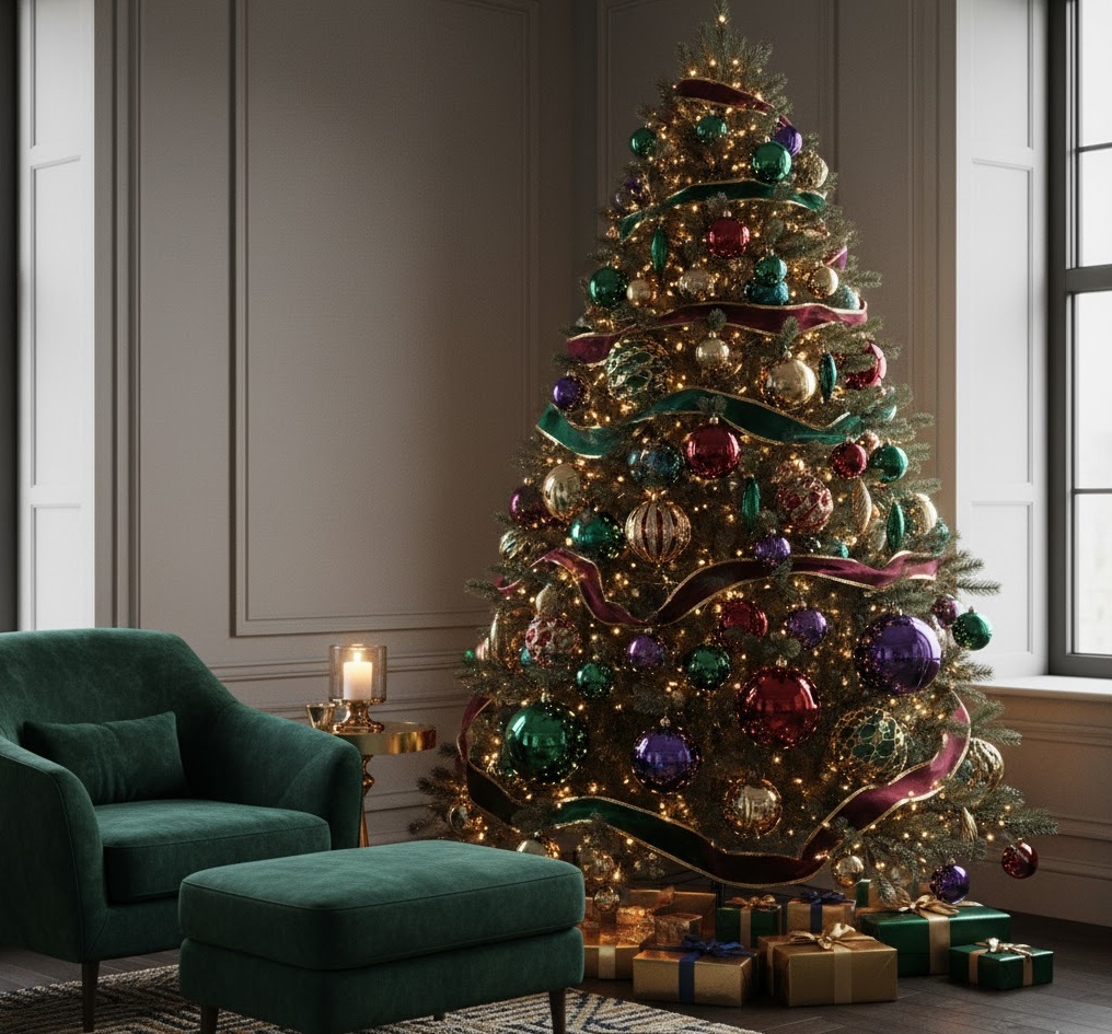 Indulge in opulence with glamorous jewel tone christmas tree decorating, a style that exudes luxury and sophistication. This rich aesthetic uses deep, saturated colours like emerald green, sapphire blue, amethyst purple, and ruby red, often accented with gold or silver. Ornaments are typically ornate, sparkling, and oversized, made from materials such as velvet, glass, and polished metal. The mood is dramatic, luxurious, and utterly captivating, perfect for creating a show-stopping centrepiece in a formal living space. Functionally, it transforms your tree into a dazzling display of colour and light, offering a truly magnificent festive statement.