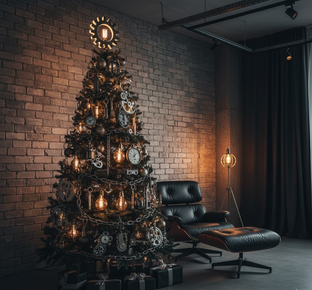 For an edgy, urban aesthetic, consider industrial loft christmas tree decorating. This unconventional style embraces raw materials and a utilitarian feel, often featuring metallic ornaments, exposed Edison bulbs, gears, and perhaps even some repurposed industrial elements. The colour palette is typically monochromatic or muted, with greys, blacks, silvers, and deep bronzes, allowing textures to stand out. Materials include metal, concrete, distressed wood, and glass. The mood is cool, contemporary, and sophisticated, perfect for modern loft apartments or spaces with an industrial design influence. Functionally, it offers a unique, non-traditional festive statement that complements a rugged yet refined interior.