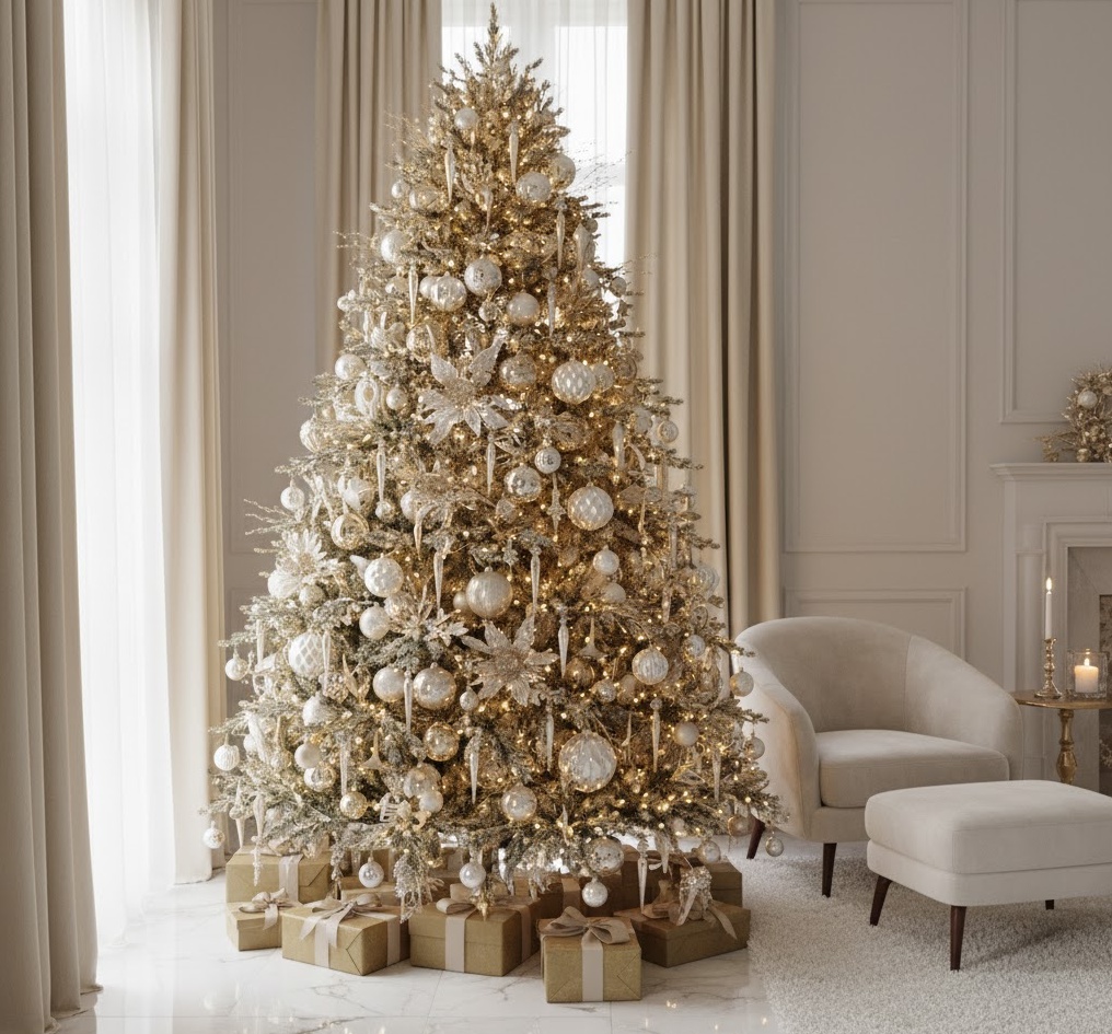 Elevate your festive display with luxurious gold white christmas tree decorating, a truly opulent and refined aesthetic. This sophisticated style combines crisp whites and creams with shimmering golds, creating an atmosphere of grandeur and elegance. Ornaments are often elaborate, featuring intricate designs, glitter, pearls, and delicate glasswork. Materials like silk, velvet, polished metal, and crystal contribute to the lavish mood. Functionally, it transforms your tree into a dazzling centrepiece, reflecting light beautifully and adding an undeniable touch of high-end glamour to any formal living space or grand entrance hall.