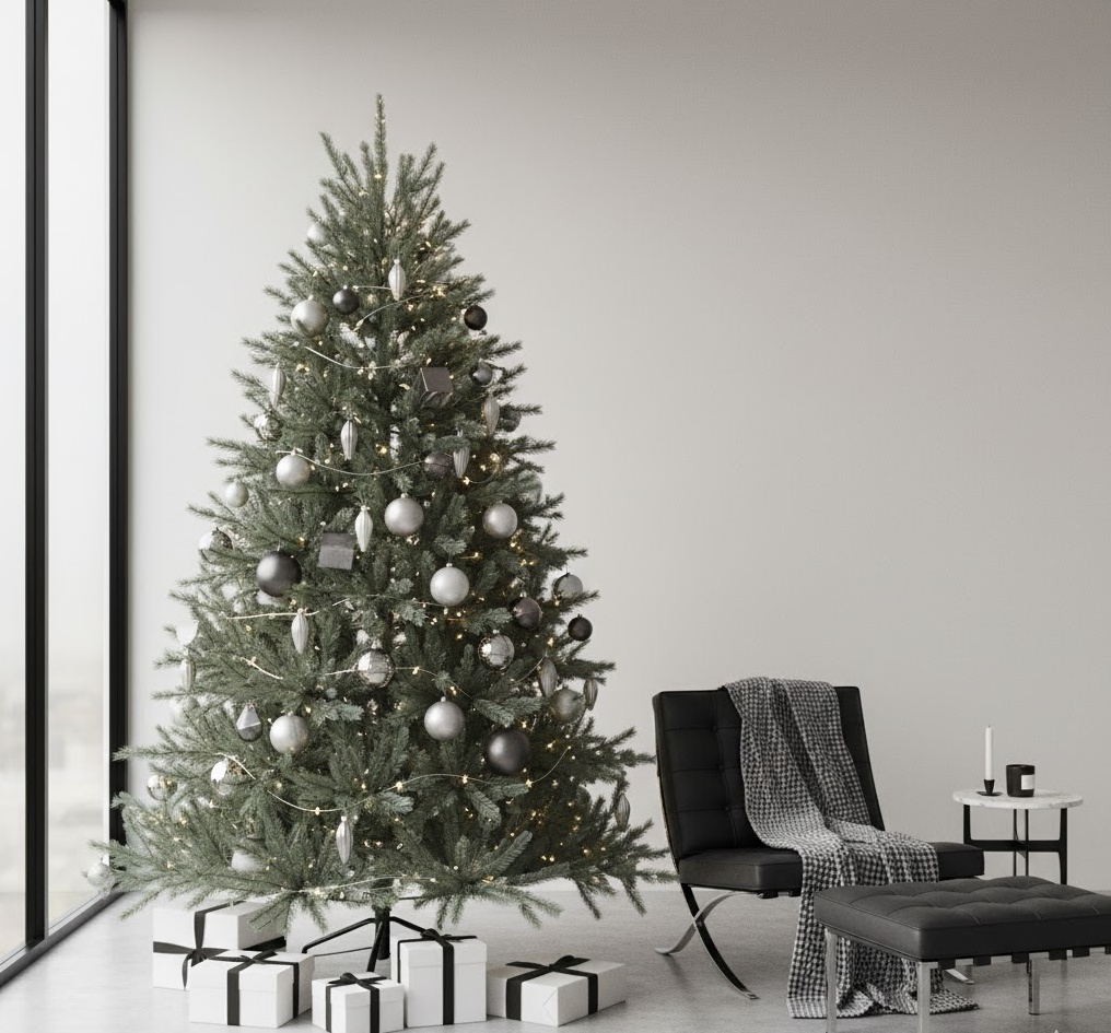 Modern minimalist christmas tree decorating focuses on clean lines, understated elegance, and a less-is-more approach. This style often uses a limited colour palette, typically whites, silvers, greys, or even a single accent colour, allowing the tree’s natural beauty to shine. Ornaments are simple, geometric, or abstract, made from materials like glass, matte metals, or ceramic. The mood is calm, sophisticated, and uncluttered, perfect for contemporary interiors seeking a refined festive touch. Functionally, it avoids visual noise, creating a serene focal point that complements modern design principles without overwhelming the space.