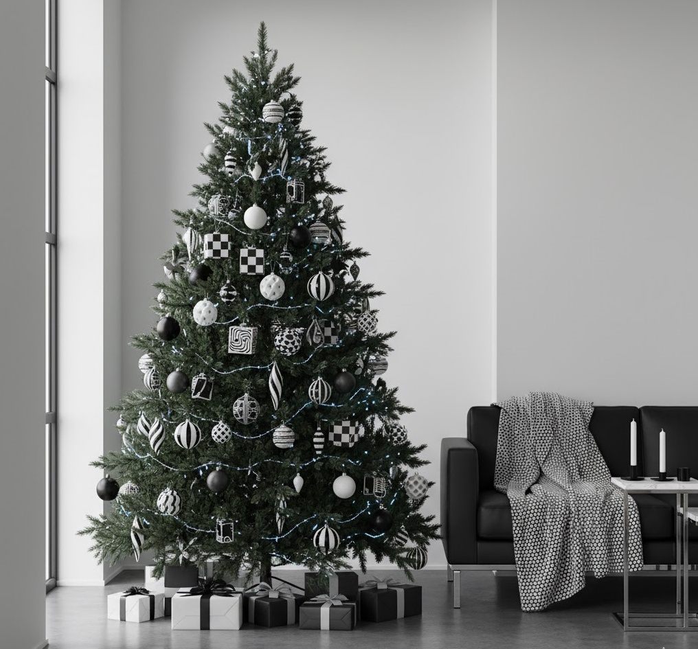 Make a bold, sophisticated statement with monochrome black white christmas tree decorating. This striking style uses a stark yet elegant palette of black, white, and various shades of grey, creating a dramatic and modern look. Ornaments are often geometric, abstract, or feature contrasting patterns, made from materials like matte glass, glossy ceramic, or polished metal. The mood is chic, contemporary, and undeniably stylish, perfect for minimalist or avant-garde interiors. Functionally, it offers a powerful visual impact, providing a sophisticated backdrop that allows other festive elements to truly pop, or standing alone as a statement piece.