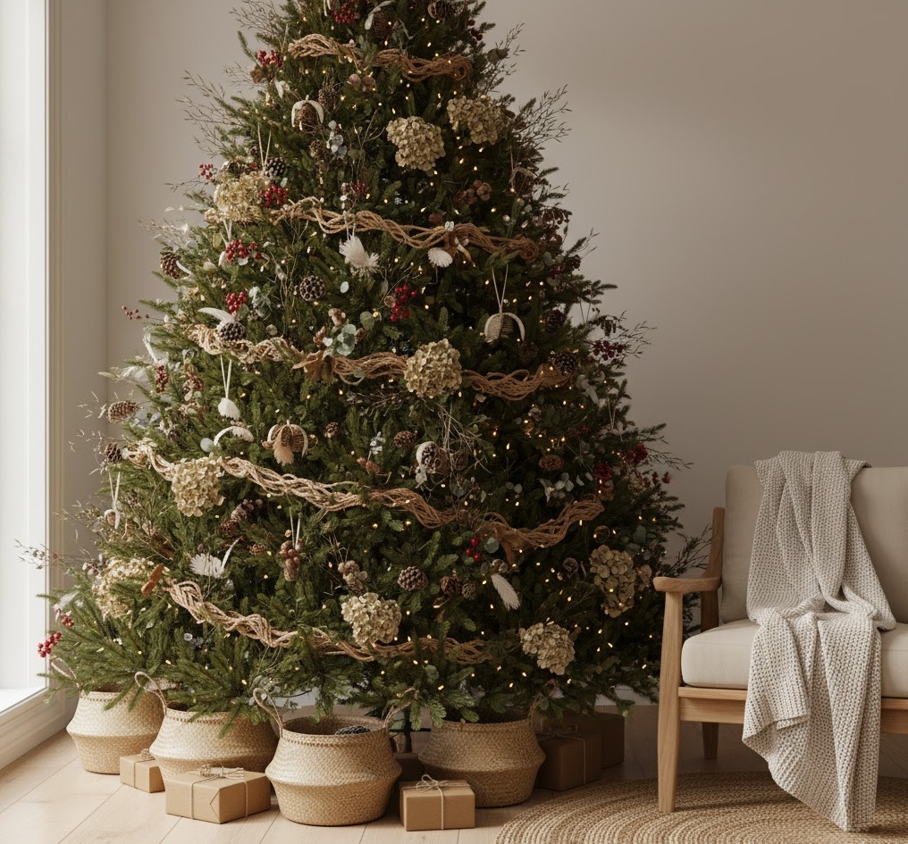 Connect with the outdoors through nature inspired christmas tree decorating. This organic style celebrates the beauty of the natural world, incorporating elements like dried flowers, seed pods, feathers, berries, and real or faux foliage. The colour palette is earthy and serene, featuring greens, browns, creams, and subtle pops of deep red or orange. Materials are predominantly natural, such as wood, twine, dried botanicals, and glass. The mood is tranquil, harmonious, and grounding, bringing a sense of peace and natural beauty into your home. Functionally, it creates an eco-conscious and beautifully understated festive display.