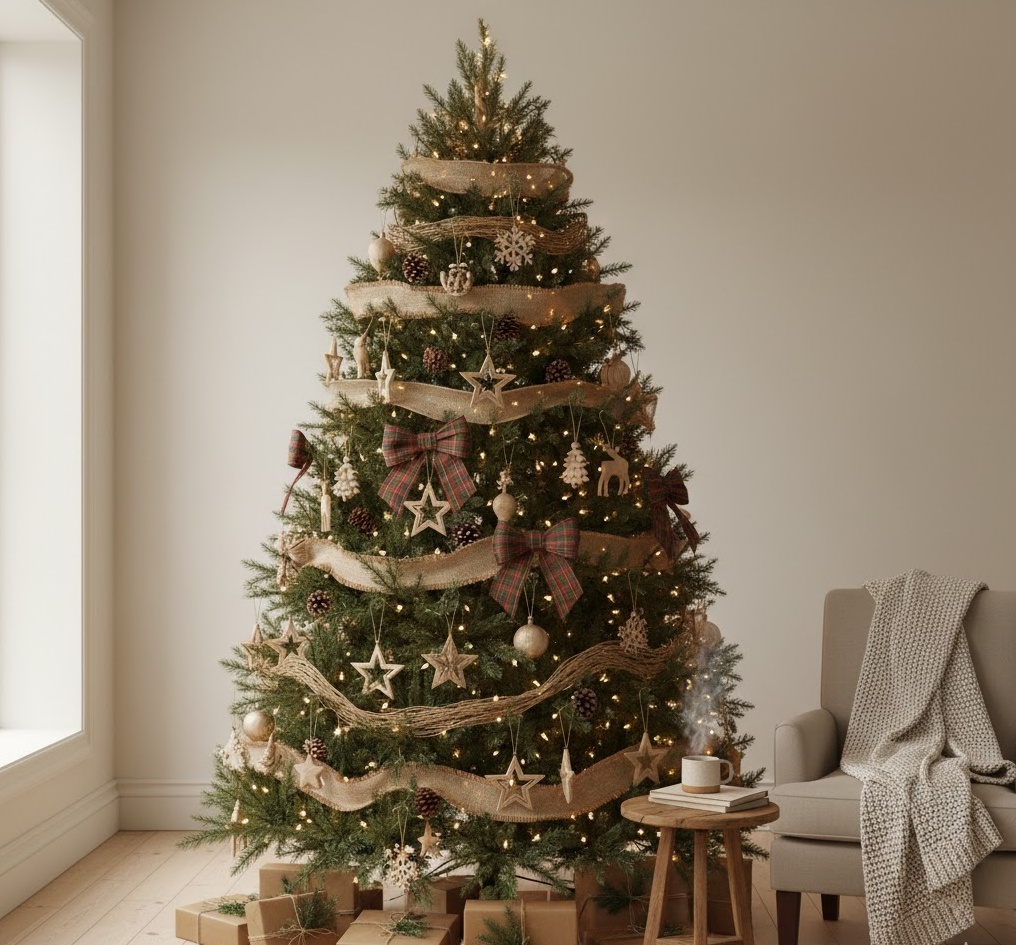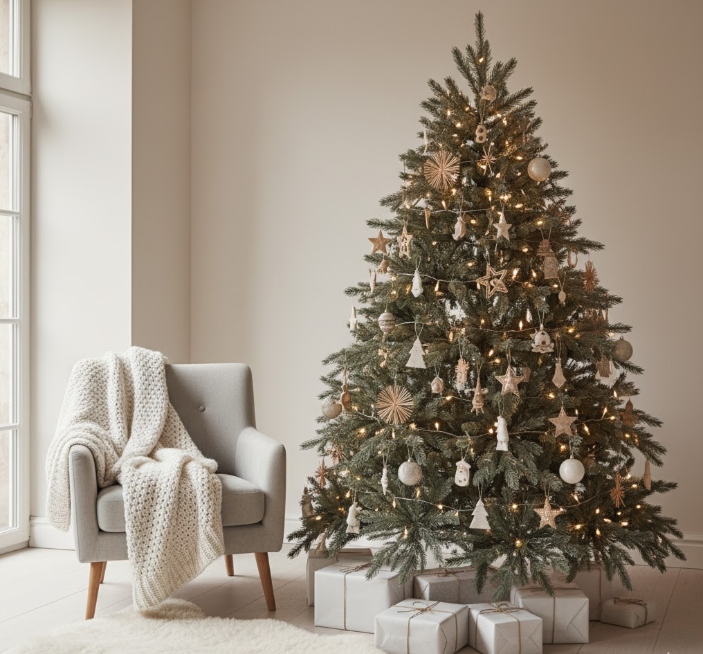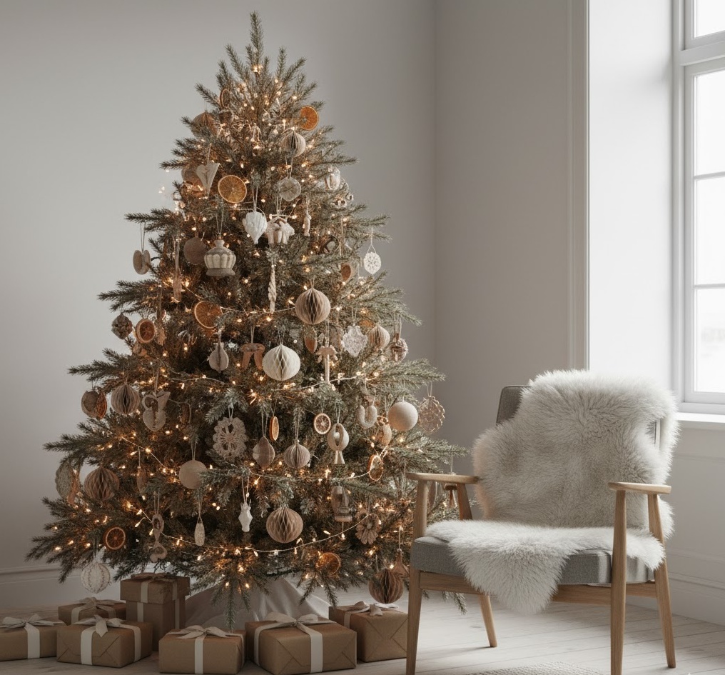 Embrace the warmth of Nordic design with Scandi chic christmas tree decorating, a style that prioritises natural materials, light colours, and a sense of hygge. This aesthetic often features white, grey, and natural wood tones, accented with pops of muted green or soft red. Ornaments are typically handmade or natural, such as straw stars, wooden figures, felt decorations, and simple white lights. The mood is cosy, inviting, and serene, perfect for creating a tranquil festive haven. Functionally, it brings a sense of calm and understated beauty, blending seamlessly with minimalist or contemporary Scandinavian-inspired interiors.