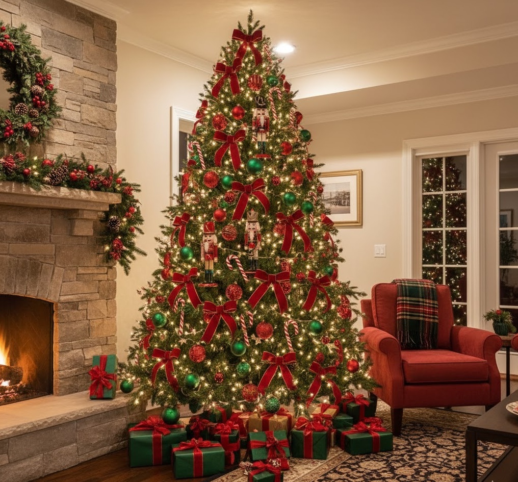 Revisit the roots of Christmas with traditional green red tree decorating, a timeless and universally loved aesthetic. This classic style relies on the iconic pairing of deep forest green (from the tree itself) and vibrant holly red, often complemented by touches of gold or white. Ornaments typically include classic round baubles, festive bows, candy canes, and perhaps some nutcrackers or Santa figures. Materials like glass, fabric, and painted wood contribute to a warm, familiar, and comforting mood. Functionally, it creates an instantly recognisable and welcoming festive atmosphere, perfect for any home seeking a heartfelt and enduring holiday look.