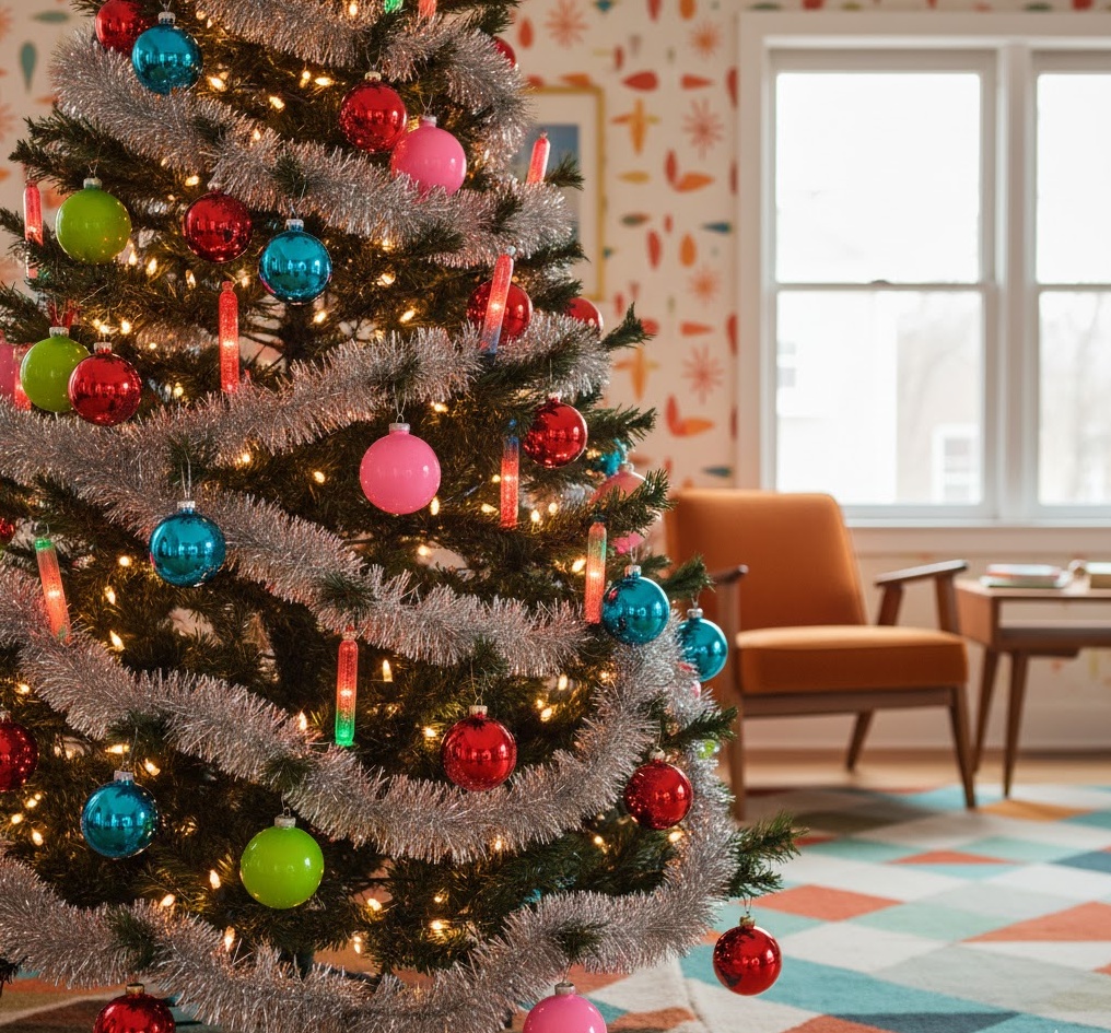 Step back in time with vintage retro christmas tree decorating, celebrating the charm and nostalgia of past decades. This style often features colourful, kitschy ornaments from the 1950s-70s, such as Shiny Brite baubles, tinsel garlands, and bubble lights. The colour palette is typically bright and varied, including vibrant reds, blues, greens, and pinks, often with a metallic sheen. Materials like glass, plastic, and tinsel create a playful and joyful mood. Functionally, it evokes a sense of childhood wonder and cherished memories, making it a delightful choice for those who appreciate a touch of historical whimsy in their festive display.