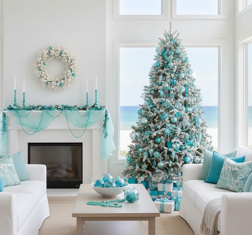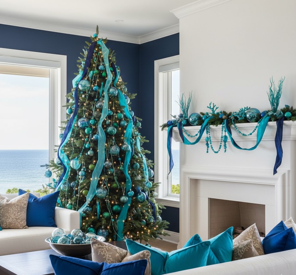 Aqua Blue Christmas Decor immerses your home in the refreshing and calming hues of the ocean, creating vibrant yet serene coastal Christmas decorations. The primary colour palette revolves around various shades of aqua, turquoise, teal, and seafoam green, often complemented by crisp whites and sandy neutrals to enhance the oceanic feel. Materials are typically light and reflective, including glass, polished ceramics, and sheer fabrics, mimicking the transparency and movement of water. Functionally, this style aims to create a bright and airy atmosphere, evoking the feeling of a sunlit ocean. Think shimmering aqua baubles, garlands of iridescent beads, and decorative elements resembling coral or sea glass in various blue tones. The mood is one of tranquil refreshment and vibrant calm, perfect for a Christmas that feels both festive and deeply relaxing, bringing the serene beauty of the sea indoors.