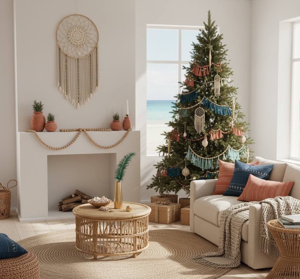 Boho Beach Christmas Decor infuses free-spirited bohemian vibes with the relaxed charm of the coast, creating uniquely eclectic coastal Christmas decorations. The colour palette is vibrant yet earthy, combining sandy neutrals, terracotta, deep blues, and pops of coral or teal, often with metallic gold accents. Materials are diverse and textured, including macramé, rattan, woven textiles, natural wood, and an array of shells and beads. Functionally, this style encourages layering and personal expression, with cosy floor cushions, draped fabrics, and an abundance of unique, handcrafted items. Think macramé Christmas tree ornaments, shell-adorned dreamcatchers, and garlands made from colourful tassels and natural beads. The mood is one of relaxed artistry and joyful individuality, perfect for a creative and unconventional festive season. This style celebrates global influences and natural beauty, making for a truly unique and inviting holiday space.