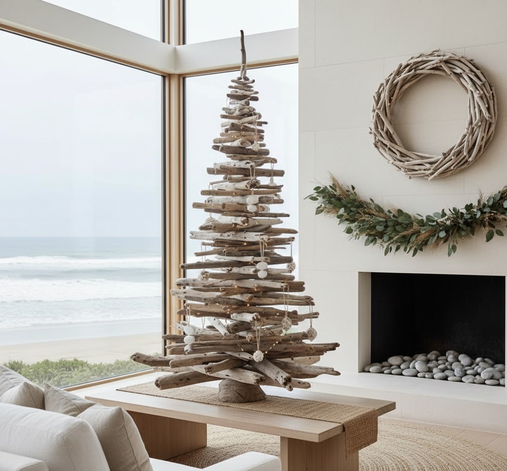 Driftwood Christmas decorations bring an organic, rustic charm to your festive coastal home, celebrating the raw beauty of nature’s artistry. This style predominantly uses weathered timber, often in its natural grey, beige, and brown tones, complemented by soft whites and muted greens for a truly earthy feel. Materials are primarily found objects from the beach, such as various pieces of driftwood, pebbles, and natural fibres like jute or twine. Functionally, driftwood is ingeniously repurposed into unique festive elements; imagine a Christmas tree constructed entirely from stacked driftwood pieces, or garlands adorned with small, smooth driftwood segments. The mood is one of natural simplicity and understated warmth, creating a cosy and authentic seaside holiday atmosphere. These unique, handcrafted pieces add character and a story to your decor, making your coastal Christmas truly distinctive and environmentally conscious.