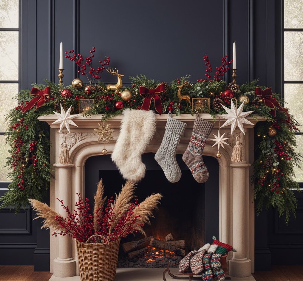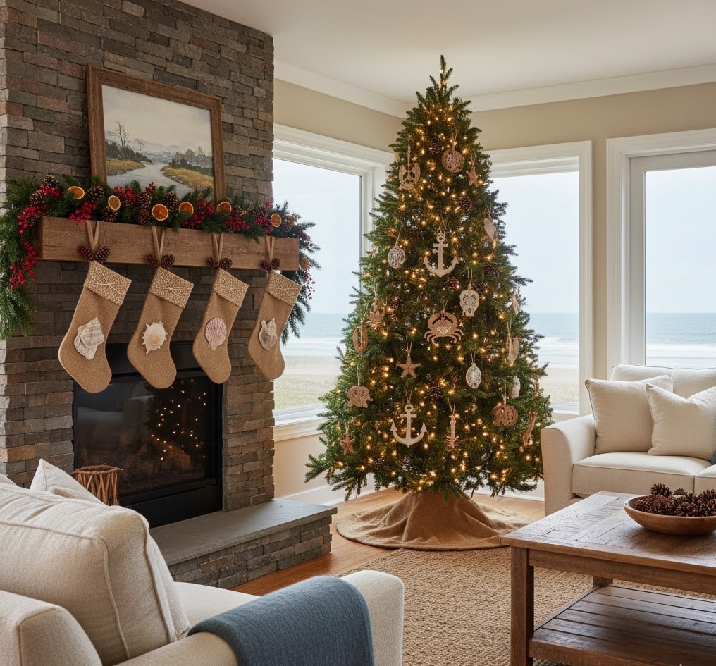 Rustic Coastal Christmas Charm combines the warmth of country living with the serene beauty of the seaside, creating inviting coastal Christmas decorations. The colour palette is rich and earthy, featuring warm browns, deep greens, cream, and muted blues, often accented with natural red berries or burlap tones. Materials are robust and natural, including reclaimed wood, burlap, twine, pinecones, and rough-hewn fabrics, all contributing to a wholesome, handcrafted feel. Functionally, this style prioritises comfort and a sense of history, with sturdy furniture adorned with cosy throws and handmade decorations. Think wooden ornaments carved with sea creatures, burlap stockings embellished with shells, and garlands woven from pinecones, dried oranges, and natural rope. The mood is one of heartfelt warmth and nostalgic simplicity, perfect for a cosy, traditional Christmas with a distinct seaside twist, evoking cherished memories and a welcoming atmosphere.