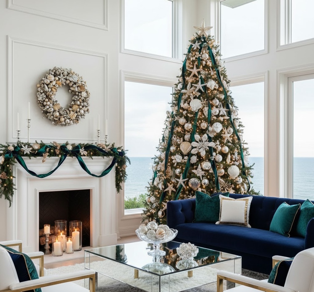 Glamorous Coastal Christmas elevates seaside festive decor to a luxurious level, creating dazzling coastal Christmas decorations with a touch of opulence. The colour palette is sophisticated and shimmering, featuring crisp whites, deep navy or emerald green, and abundant metallic accents like gold, silver, or rose gold. Materials are rich and reflective, including polished metals, mirrored surfaces, velvet, silk, and sparkling glass or crystal. Functionally, this style focuses on creating a lavish and celebratory atmosphere, with plush furnishings and statement lighting. Think oversized, glittering shell ornaments, crystal-encrusted starfish, and garlands adorned with metallic beads and shimmering ribbons. The mood is one of sophisticated indulgence and festive sparkle, perfect for a truly memorable and luxurious holiday season. This glamorous approach ensures your coastal home radiates elegance and festive grandeur, making every moment feel special and celebratory.
