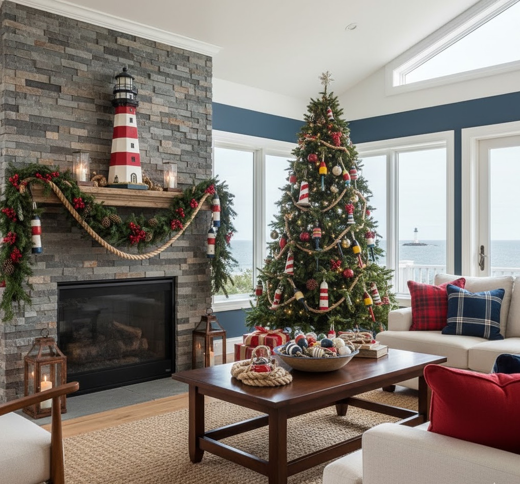 Embrace the spirit of the high seas with nautical Christmas home styling, a distinctive take on coastal Christmas decorations that celebrates maritime heritage. This style prominently features a colour scheme of deep navy blues, crisp whites, and vibrant reds, often complemented by natural wood tones and polished brass accents. Materials like rope, canvas, and polished timber are central, creating a robust yet refined aesthetic. Functionally, this decor often incorporates elements like miniature lighthouses, ship’s wheels, and anchor motifs into wreaths, garlands, and tree ornaments, making a bold statement. The mood is one of adventurous elegance and timeless tradition, perfect for those who adore the sea and its rich history. Expect to see festive stockings embroidered with anchors, model sailboats adorned with tiny fairy lights, and glass buoys repurposed as unique holiday ornaments, all contributing to a cohesive and captivating maritime theme.