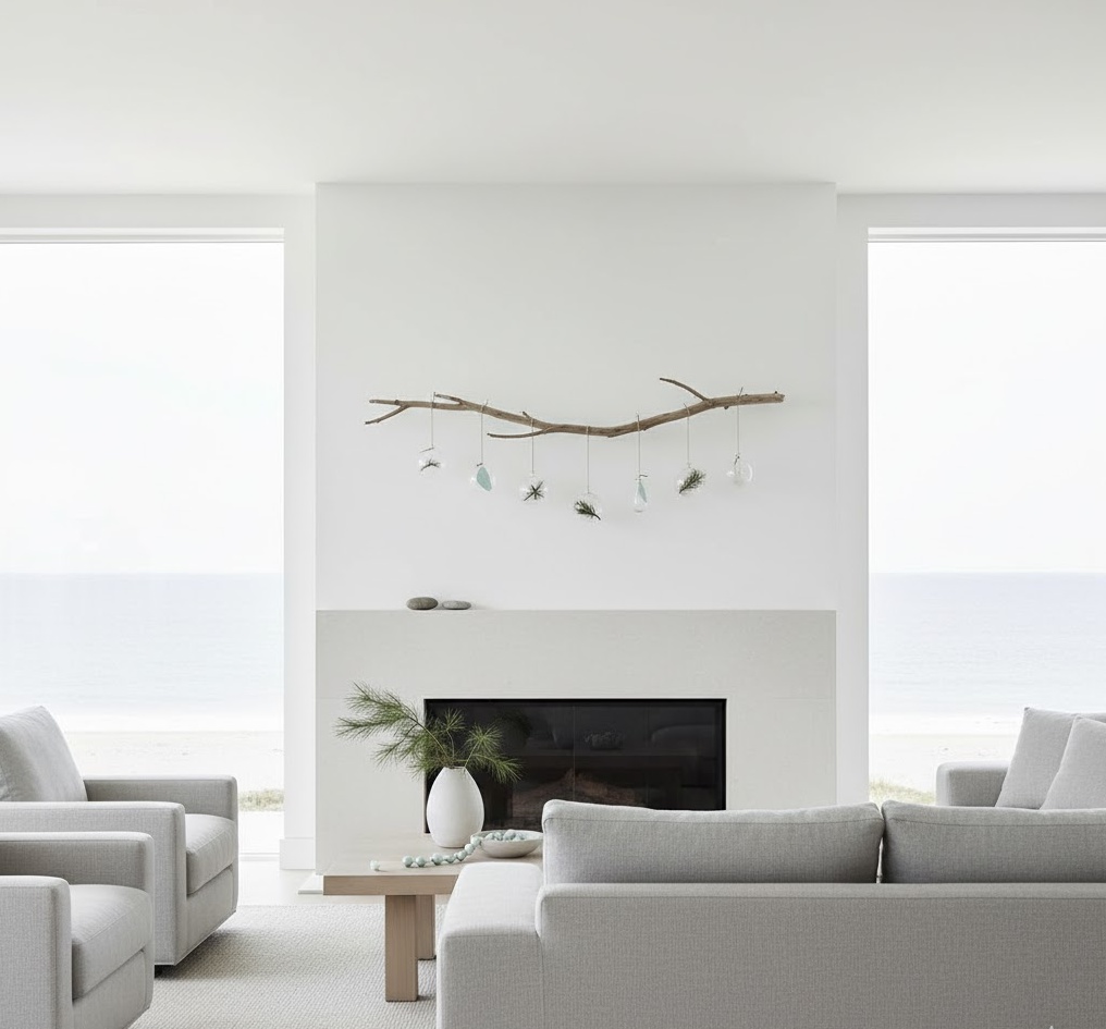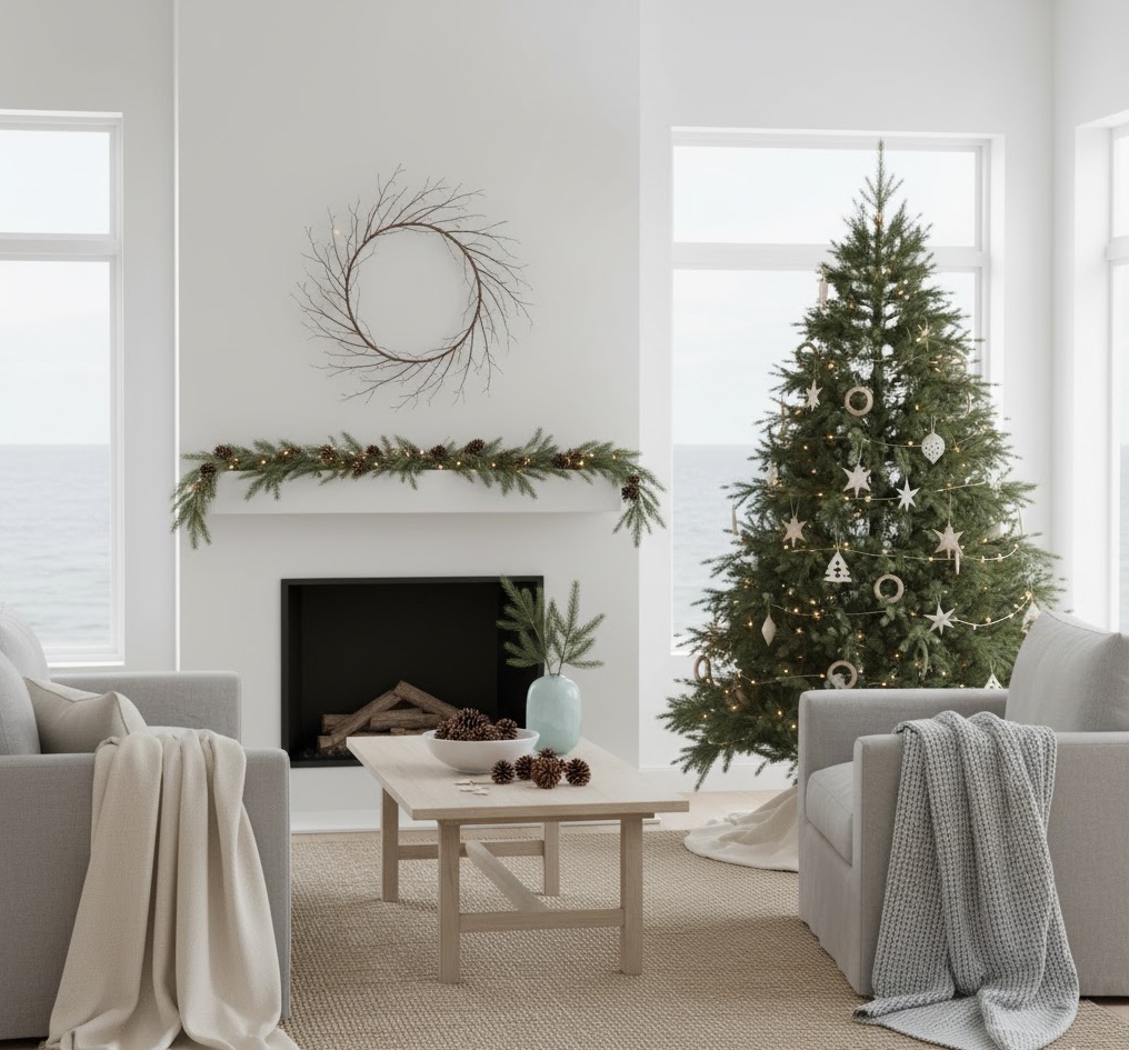 Minimalist Coastal Christmas offers a serene and uncluttered approach to coastal Christmas decorations, focusing on simplicity and thoughtful placement. The colour palette is exceptionally restrained, typically featuring crisp whites, soft greys, natural wood tones, and perhaps a single, subtle accent of pale blue or green. Materials are natural and understated, such as light wood, linen, ceramic, and glass, chosen for their texture and quality rather than elaborate design. Functionally, this style emphasises open spaces and a sense of calm, with decorations carefully selected to enhance rather than dominate the environment. Think a single, elegant driftwood branch adorned with a few delicate glass baubles, or a simple ceramic vase holding a sprig of pine. The mood is one of peaceful tranquility and refined simplicity, creating a truly calming and sophisticated festive atmosphere that allows the beauty of the coastal setting to shine through.