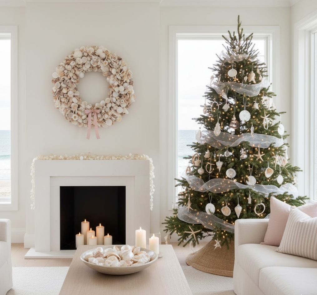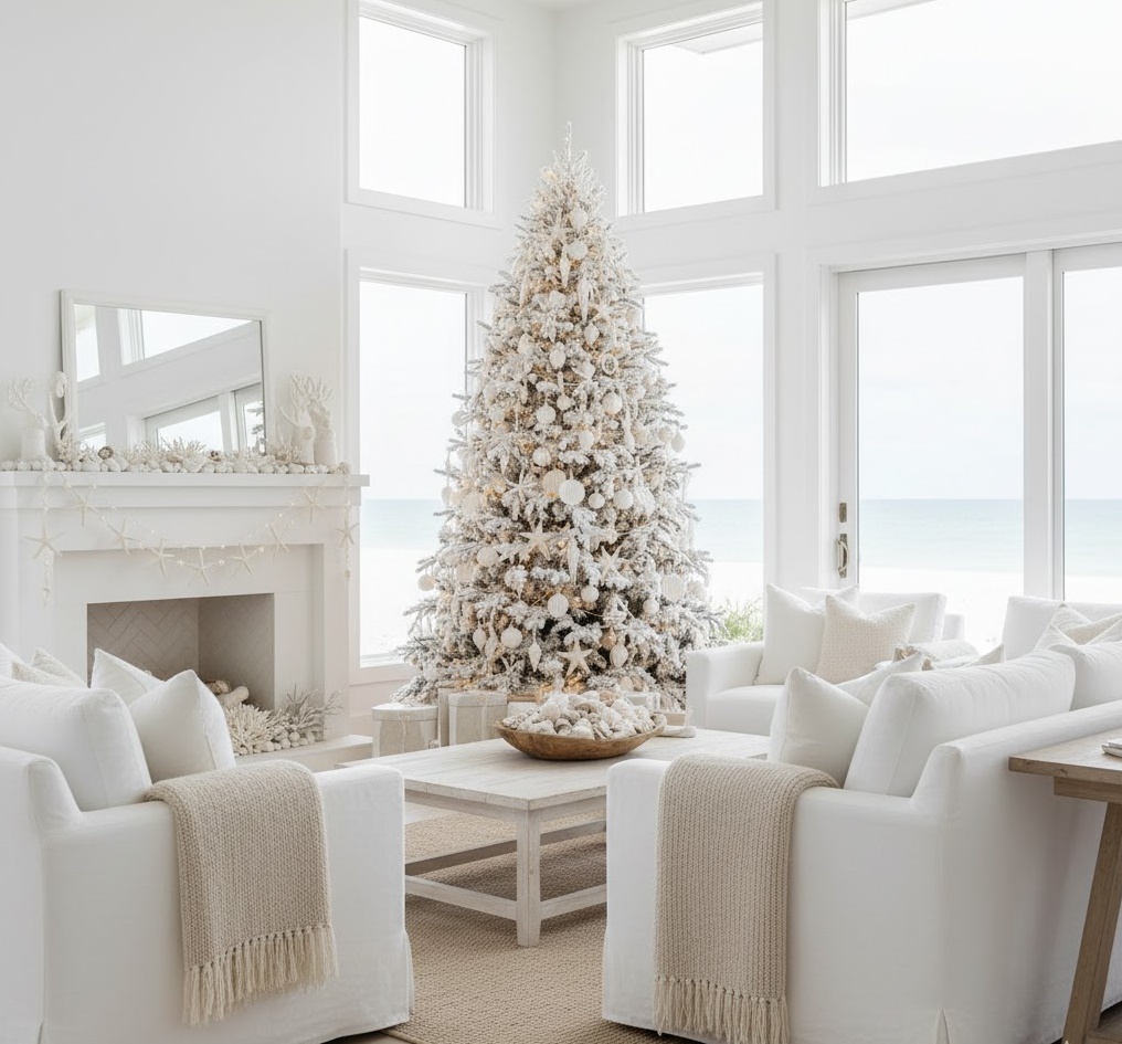 The White Sand Christmas Theme transforms your home into a pristine, sun-drenched beach, offering elegant and ethereal coastal Christmas decorations. The colour palette is dominated by pure whites, creamy ivories, and soft sandy beiges, with very subtle hints of silver or pale gold for a touch of sparkle. Materials are natural and refined, including bleached wood, linen, cotton, white coral, and various white shells, creating a clean and sophisticated aesthetic. Functionally, this style focuses on creating a bright, spacious, and serene environment, reminiscent of untouched shorelines. Think white-flocked Christmas trees adorned with white shell ornaments, garlands of bleached starfish, and delicate fairy lights that mimic starlight over the ocean. The mood is one of serene purity and understated elegance, perfect for a sophisticated and tranquil Christmas that feels both luxurious and deeply calming, celebrating the quiet beauty of a winter beach.