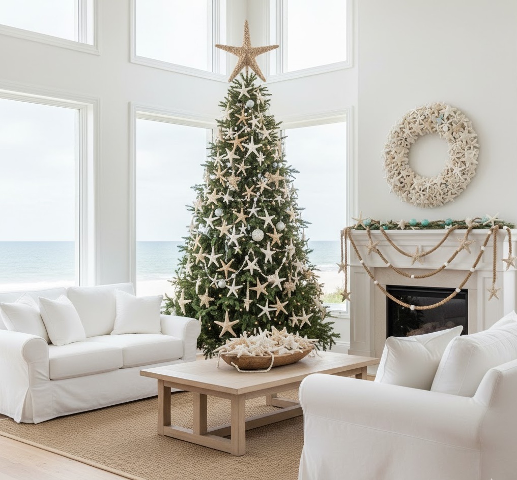Starfish Christmas Accents highlight the iconic five-pointed sea creature, creating charming and distinctive coastal Christmas decorations. The colour palette is versatile, often featuring natural sandy tones, crisp whites, and soft blues, allowing the starfish to stand out as a central motif. Materials are primarily natural, including real or replica starfish, natural fibres like jute or cotton, and light-coloured woods. Functionally, this style integrates starfish into every aspect of the festive decor, offering a cohesive and delightful theme. Think starfish tree toppers, garlands strung with various sizes of starfish, and individual starfish ornaments adorning the branches. The mood is one of playful elegance and natural beauty, perfect for a Christmas that feels uniquely connected to the ocean. These charming accents bring a touch of marine wonder to your holiday home, creating a memorable and visually appealing festive display.
