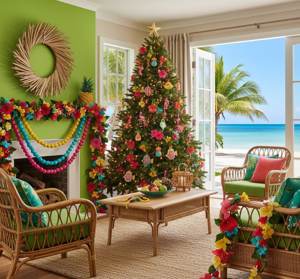Tropical Coastal Christmas Joy brings a vibrant, exotic twist to traditional festive decor, creating uniquely lively coastal Christmas decorations. The colour palette is bold and cheerful, featuring bright greens, fuchsia, coral, turquoise, and sunny yellows, often complemented by natural wood and rattan. Materials are light and natural, including bamboo, rattan, palm leaves, and vibrant textiles, evoking a lush, warm climate. Functionally, this style is about creating a festive, celebratory atmosphere that feels distinctly summery, even during winter. Think ornaments shaped like pineapples, flamingos, or tropical fish, garlands made from colourful flowers or exotic leaves, and fairy lights strung through bamboo structures. The mood is one of playful exuberance and sun-drenched happiness, perfect for a unique and memorable Christmas celebration that defies traditional winter imagery, bringing a burst of warmth and colour to your home.