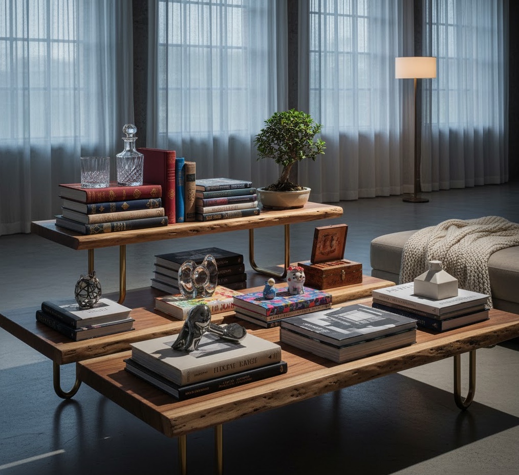 Infuse joy and personality with playful whimsical coffee table books styling. This light-hearted approach features books with quirky illustrations, pop culture references, or vibrant, imaginative covers. The coffee table can be an unconventional shape or colour, complemented by accessories like colourful figurines, novelty coasters, or small, fun trinkets. Colours are bright and varied, creating an energetic and cheerful mood that sparks conversation and smiles. Functionality is about expressing individuality and creating a space that doesn’t take itself too seriously.