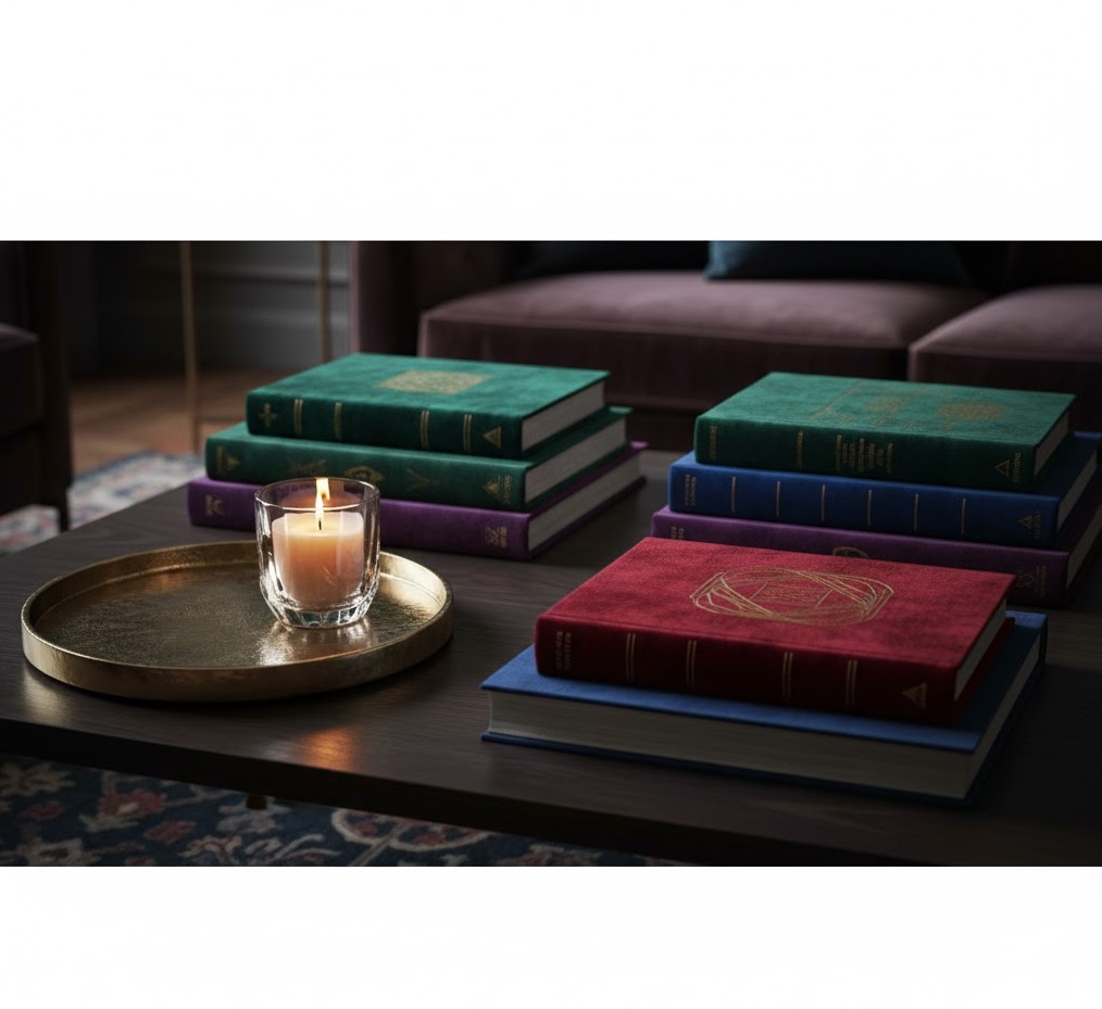 Indulge in tactile luxury with luxe velvet coffee table books styling, adding a touch of opulence to your living space. This style features books with velvet covers, rich textures, or fashion-forward themes, often in deep, jewel-toned colours. The coffee table might be a plush upholstered ottoman or a dark, polished wood piece, complemented by accessories like silk tassels, metallic trays, or scented candles in elegant holders. The mood is decadent and sophisticated, inviting touch and creating a sense of lavish comfort. Functionality is about elevating the sensory experience of your decor.