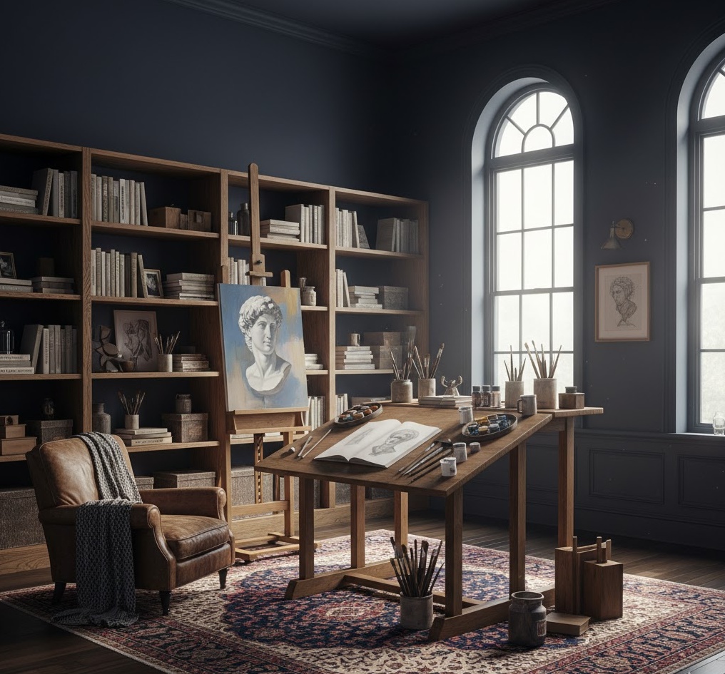 Cultivate an artistic academia studio vibe, where creative expression meets intellectual curiosity. This style embraces a more bohemian and expressive interpretation of dark academia, perfect for artists, writers, or musicians. Walls might be a deep, inspiring colour like indigo or forest green, adorned with framed sketches, abstract art, or even a large easel with an ongoing project. Furniture is functional for creative work, such as a large drafting table, a comfortable armchair for contemplation, and ample storage for art supplies and books. The mood is one of inspired creativity and thoughtful exploration, with natural light maximised where possible, complemented by adjustable task lighting and ambient lamps. Materials like raw wood, canvas, metal, and textured fabrics are prominent, creating a studio that feels both intellectually stimulating and a haven for artistic endeavour, fostering both study and creation.