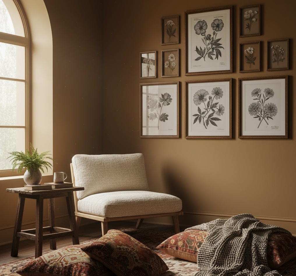 Create an inviting and eclectic bohemian academia reading nook, blending scholarly charm with free-spirited comfort. This style embraces a more relaxed, layered approach, featuring plush floor cushions, patterned throws, and a mix of vintage textiles in rich, earthy tones like terracotta, mustard, and deep olive. Walls might be adorned with tapestries, framed pressed flowers, or a gallery wall of diverse academic prints and travel souvenirs. Functionality is centred around ultimate comfort for reading, with a low-slung armchair or a large beanbag, accompanied by a small, rustic side table for tea and books. The mood is one of cosy, unpretentious intellectualism, encouraging hours of immersive reading and creative thought. Lighting is soft and warm, often from string lights, Moroccan lanterns, or a vintage floor lamp. Materials include natural fibres like linen, cotton, and wool, alongside dark wood and brass accents, creating a wonderfully lived-in and inspiring corner.