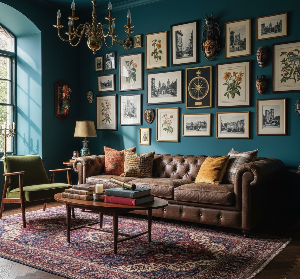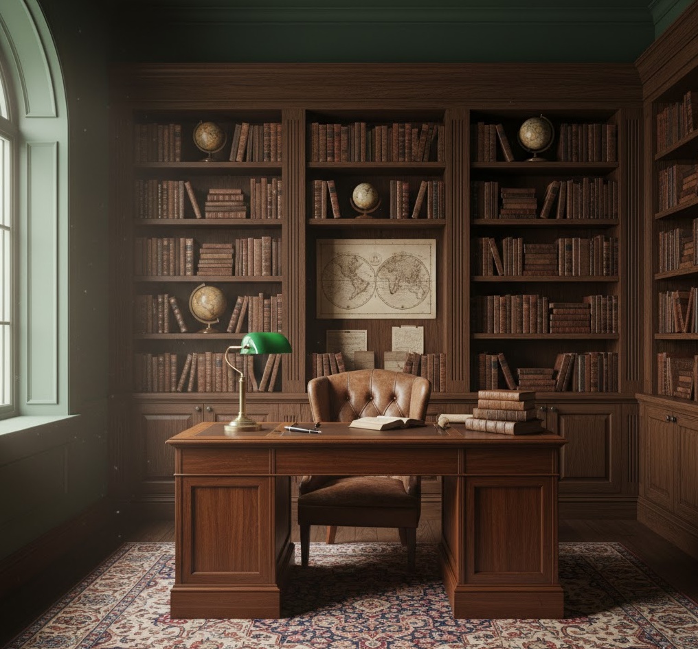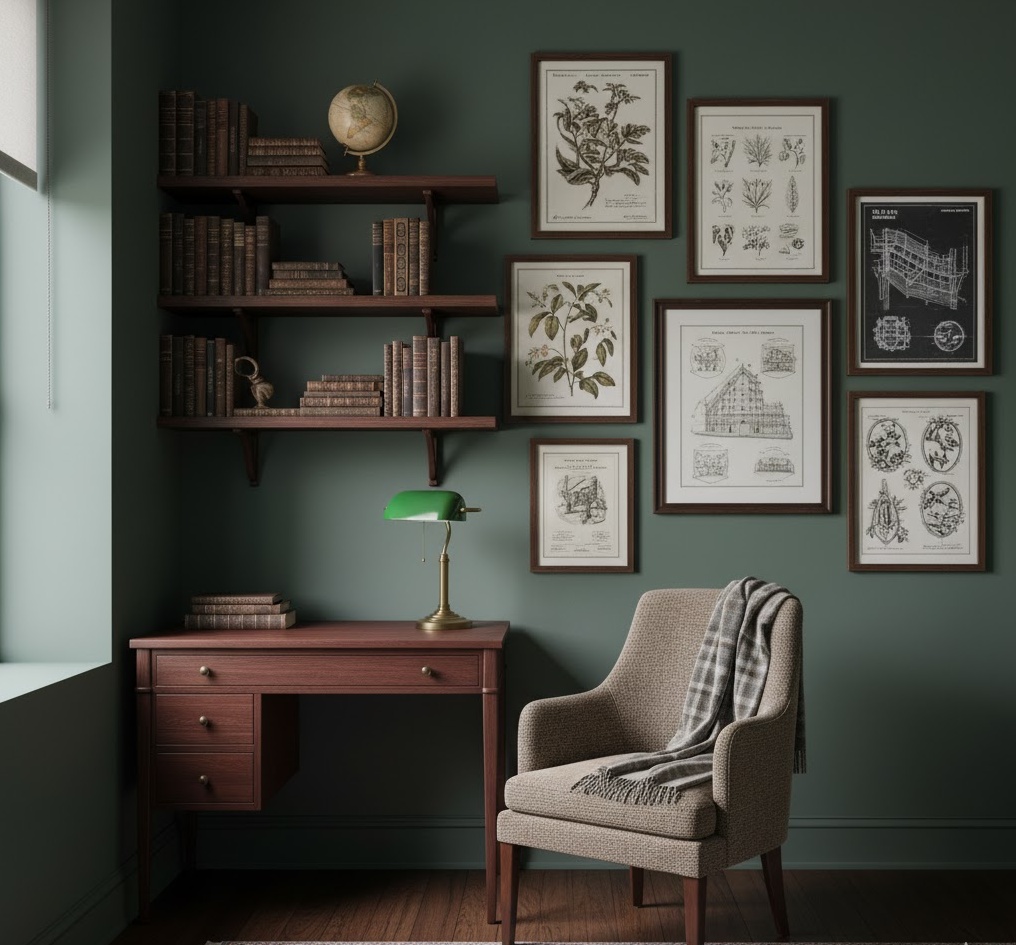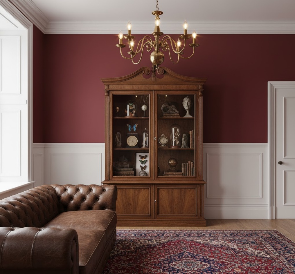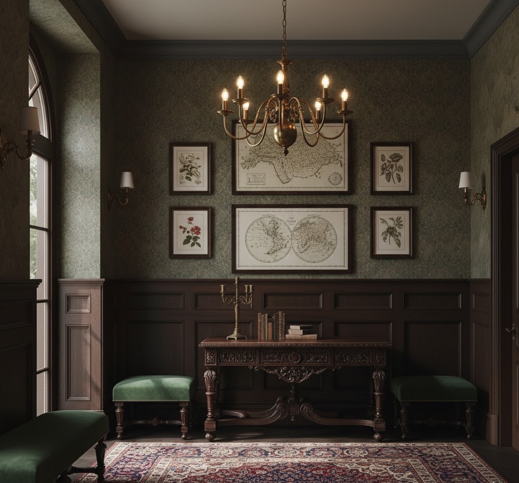 Immerse your home in the timeless elegance of a heritage dark academia interior, celebrating historical depth and enduring style. This aesthetic draws heavily on classical influences, creating spaces that feel as if they have evolved over centuries. Walls often feature traditional elements like dado rails, cornices, and deep, rich paint colours such as oxblood red, bottle green, or deep teal. Furniture is antique or reproduction, showcasing craftsmanship in dark, polished woods like mahogany, walnut, or oak, with pieces like grand display cabinets and substantial sideboards. Functionality is about creating a home that is both beautiful and practical for daily living, with ample storage and comfortable, classic seating. The mood is one of dignified history and cultivated taste, with lighting from traditional chandeliers, wall sconces, and classic table lamps. Materials like fine wood, leather, velvet, and intricate Persian rugs are essential, creating an interior that feels profoundly established, intellectual, and exquisitely refined.