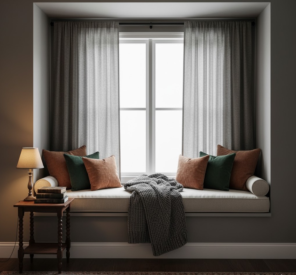 Create an intimate and inviting cozy academia alcove, perfect for moments of quiet reflection and focused reading. This style transforms a small, often overlooked space into a warm and personal intellectual retreat. Walls might be painted in a comforting, muted tone like warm grey or deep olive, or adorned with a subtle patterned wallpaper. A built-in window seat with plush cushions and throws, or a small, comfortable armchair, forms the functional heart of the alcove. Functionality is about creating a snug spot for reading, journaling, or simply enjoying a cup of tea, with a small side table or floating shelf for books and a warm beverage. The mood is one of serene comfort and gentle contemplation, with lighting often soft and ambient, perhaps from a small table lamp, string lights, or natural light filtering through sheer curtains. Materials like soft wool, linen, dark wood, and brass accents contribute to a wonderfully inviting and intellectually stimulating nook.