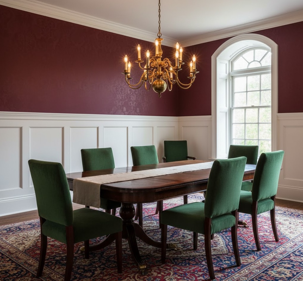 Host sophisticated gatherings in an elegant dark academia dining space, where intellectual conversation and refined taste converge. This style elevates the dining experience with a sense of historical grandeur and understated luxury. Walls are often adorned with deep, rich colours like burgundy, hunter green, or a sophisticated grey, complemented by classic wainscoting or subtle wallpaper. A substantial dark wood dining table, perhaps an antique mahogany or oak piece, forms the functional centrepiece, surrounded by upholstered dining chairs in velvet or leather. The mood is one of formal elegance and convivial intellectual exchange, with lighting provided by a grand chandelier and perhaps wall sconces, casting a warm, inviting glow. Materials like polished dark wood, fine linen tablecloths, crystal glassware, and antique silver accents are essential, creating a dining room that feels both historically rich and perfectly suited for contemporary scholarly discourse and memorable meals.