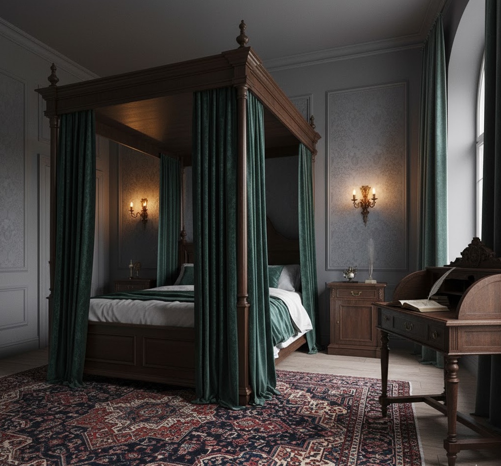 Infuse your personal sanctuary with the dramatic elegance of gothic academia bedroom design, blending scholarly pursuits with a touch of romantic mystery. This style often features a grand, dark-wood four-poster bed draped with heavy velvet or linen curtains in deep jewel tones like amethyst, emerald, or sapphire. Walls might be painted in charcoal grey, deep plum, or even feature subtle damask wallpaper, creating a moody yet sophisticated backdrop. Functionality includes a small, ornate writing desk or vanity, perhaps a vintage dressing table, providing a space for reflection or journaling. The mood is one blend of introspection and dramatic flair, with lighting often dim and atmospheric, utilising candelabras, wrought-iron sconces, and bedside lamps with dark shades. Materials such as dark carved wood, wrought iron, velvet, and rich brocades are key, creating a luxurious and profoundly evocative sleeping environment that feels both ancient and deeply personal.
