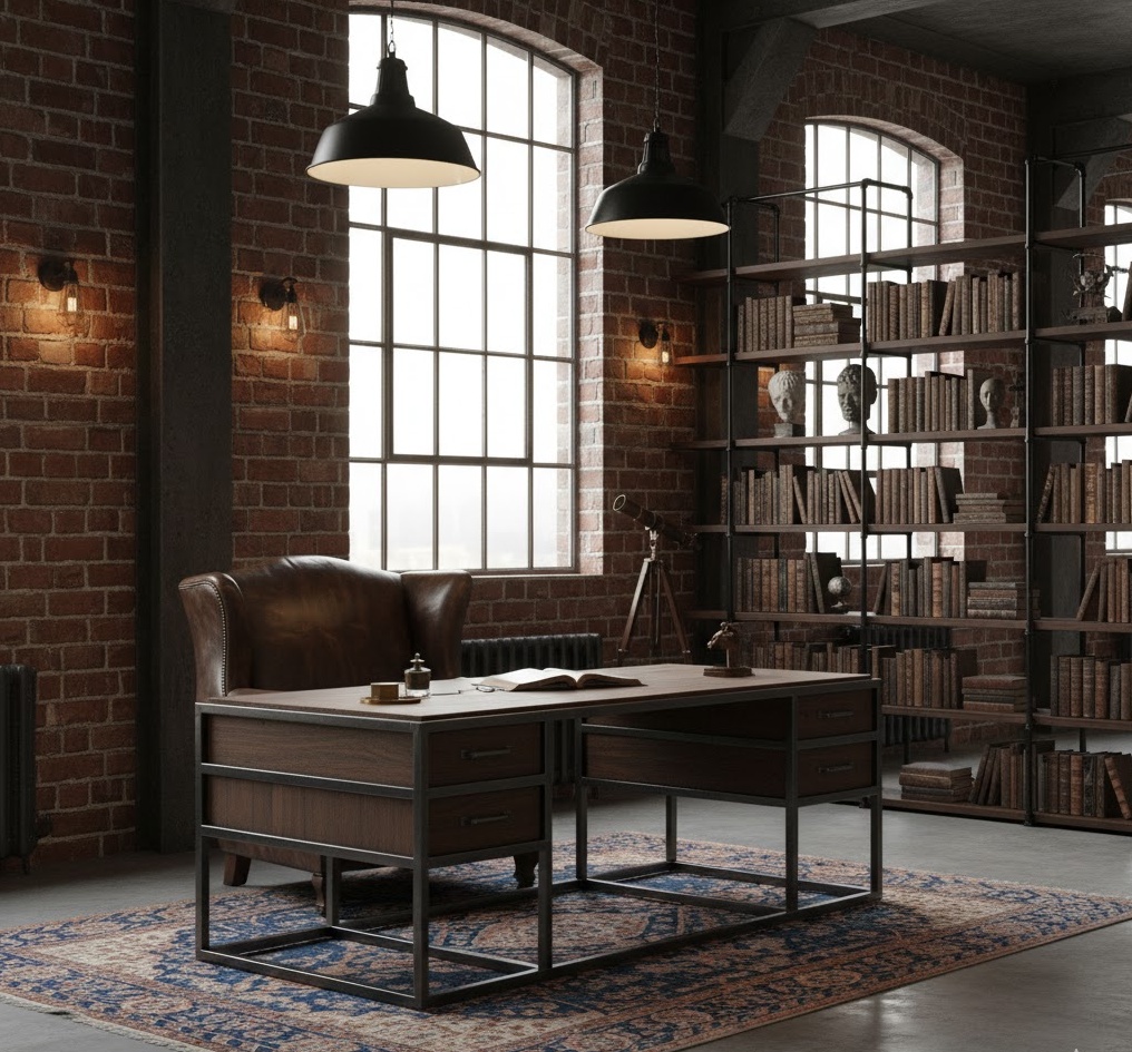 Blend raw urban aesthetics with scholarly sophistication in an industrial academia loft style, perfect for a modern, intellectual living space. This design embraces exposed brick, concrete, and metal elements, softened by academic touches. Walls might feature exposed brick or a dark, matte grey, providing a rugged backdrop. Furniture combines industrial pieces, such as a metal-framed desk or shelving unit, with more traditional dark wood or leather items, creating a compelling contrast. Functionality is about open-plan living and versatile workspaces, with modular shelving systems for books and artefacts. The mood is one of edgy intellectualism and creative energy, with lighting often featuring exposed bulbs, track lighting, or vintage factory lamps. Materials like steel, reclaimed wood, concrete, and distressed leather are prominent, creating a loft that feels both contemporary and deeply rooted in a passion for knowledge and urban exploration.