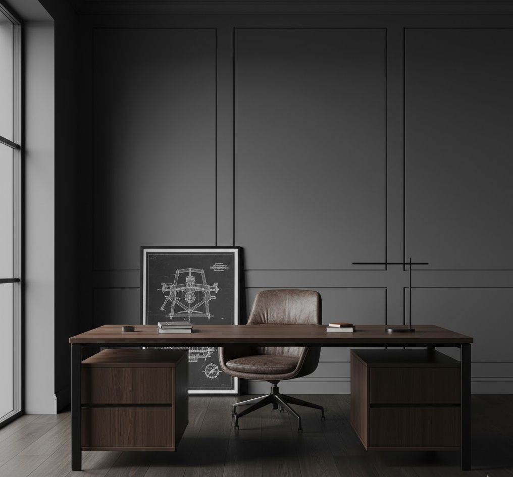 Reimagine your workspace with a modern academia office space, blending contemporary design with classic scholarly elements. This aesthetic prioritises clean lines, ergonomic functionality, and a sophisticated, uncluttered environment conducive to productivity. Walls are often painted in sophisticated neutrals like charcoal, deep grey, or muted navy, providing a sleek backdrop for carefully curated academic accents. Furniture is streamlined and functional, featuring a minimalist desk with integrated storage, perhaps crafted from dark wood or a combination of wood and metal. The mood is one of focused efficiency and intellectual clarity, with smart lighting solutions, including adjustable desk lamps and recessed ceiling lights, ensuring optimal illumination. Materials like polished concrete, dark metal, glass, and high-quality leather or wool textiles are prominent, creating an office that feels both cutting-edge and deeply rooted in scholarly tradition, perfect for the contemporary intellectual.