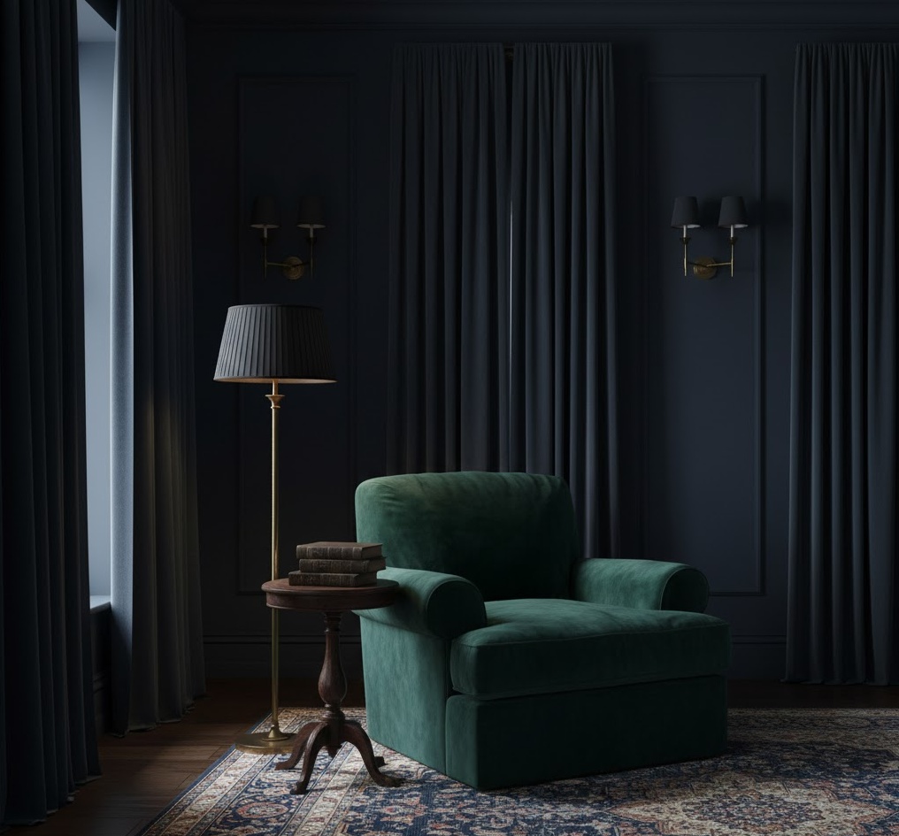 Immerse yourself in the atmospheric depths of a moody academia reading room, designed for profound literary escapism. This style embraces darker palettes and rich textures to create an intimate and enveloping space. Walls are often painted in very deep blues, forest greens, or even black, providing a dramatic backdrop for art and books. A plush, oversized armchair or chaise lounge, upholstered in velvet or a deep-pile fabric, is central to its functionality, inviting hours of comfortable reading. Lighting is deliberately dim and atmospheric, relying on multiple sources like shaded floor lamps, wall sconces, and perhaps even candles, to create pockets of warm light. The mood is one of intense focus and quiet introspection, perfect for delving into complex narratives or philosophical texts. Materials like dark wood, heavy drapes, luxurious textiles, and antique brass accents contribute to a sophisticated, almost theatrical ambience, making every reading session an event.