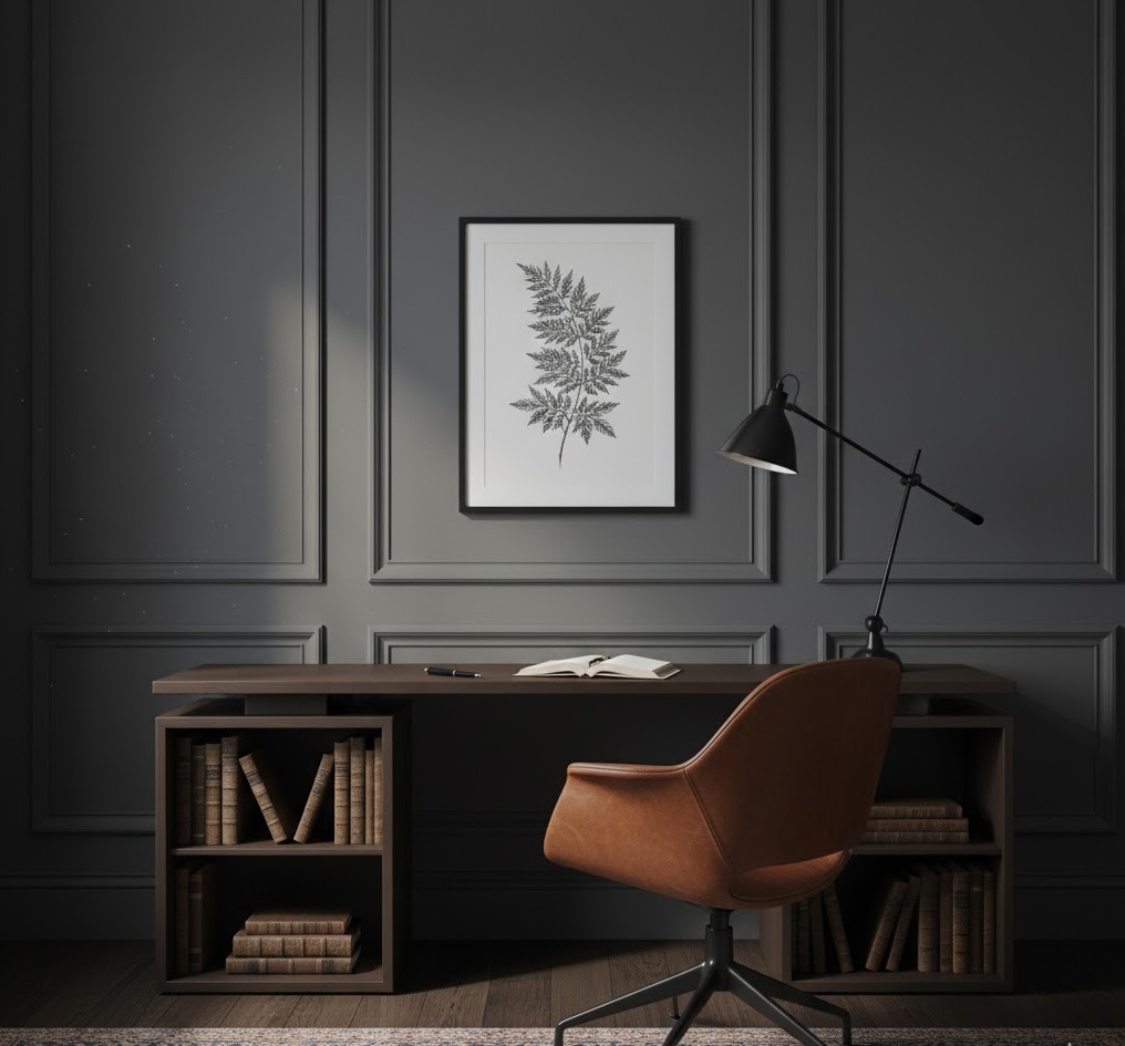 Craft a sophisticated and highly functional refined academia study nook, perfect for focused work in a compact space. This style emphasises elegant simplicity and intelligent design, making the most of every inch. Walls are typically painted in a sophisticated neutral like deep grey or muted beige, providing a calm and uncluttered backdrop. A custom-built desk or a sleek, dark wood console serves as the primary functional element, often integrated with clever shelving for books and essential study materials. The mood is one of quiet concentration and understated elegance, with minimal distractions and an emphasis on ergonomic comfort. Lighting is precise and effective, usually from a high-quality task lamp and subtle ambient lighting. Materials like dark polished wood, fine leather, and textured linen or wool are key, creating a study nook that feels both luxurious and highly conducive to serious academic work, proving that small spaces can be profoundly inspiring.