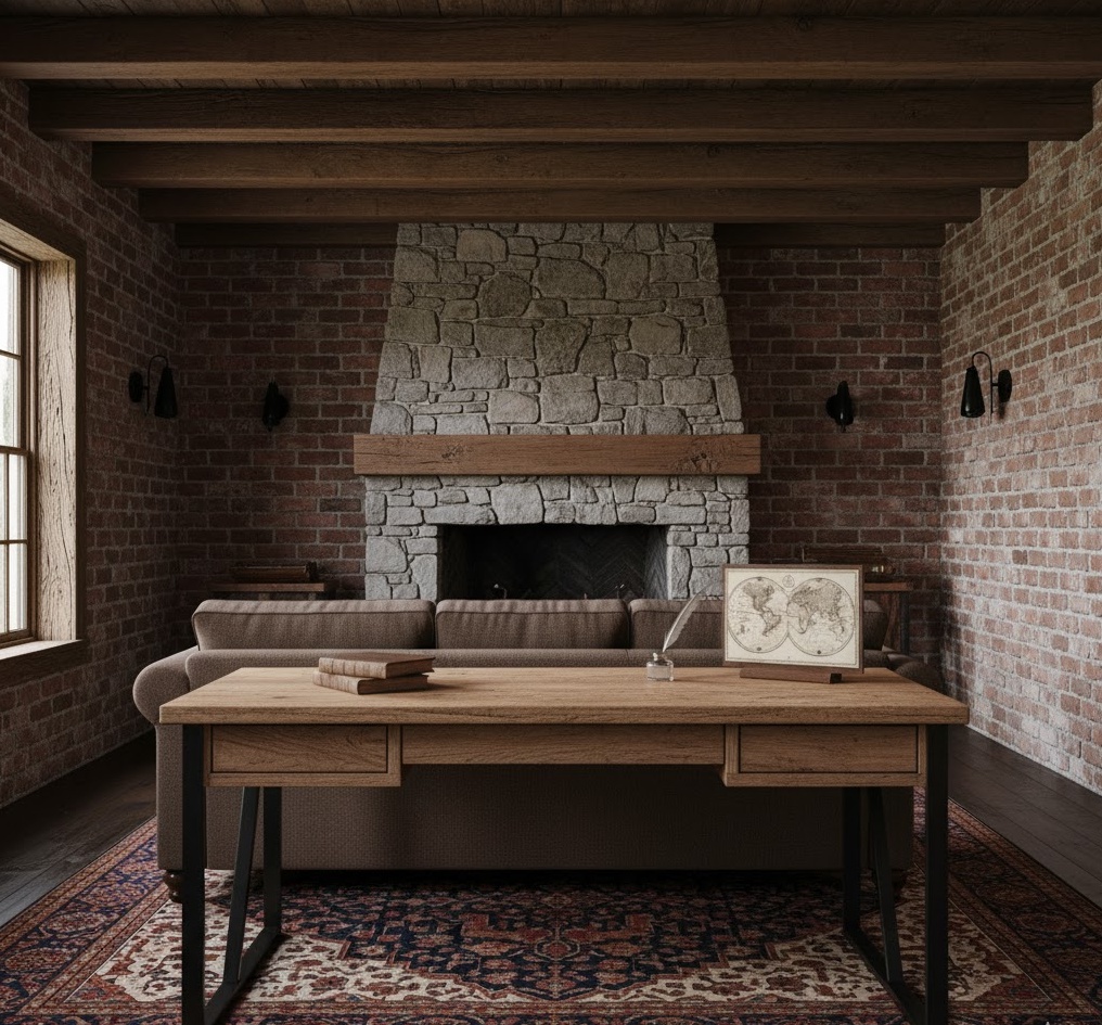 Embrace the rugged charm of a rustic dark academia den, where intellectual pursuits meet natural, unrefined beauty. This style features exposed brickwork or rough-hewn timber walls, creating a grounded and authentic backdrop. Furniture is robust and often handcrafted from reclaimed wood, such as a sturdy oak desk or a large, comfortable sofa upholstered in tweed or thick canvas. Colours are drawn from nature – deep forest greens, earthy browns, and muted greys – evoking the feeling of a secluded cabin retreat. Functionality is about durability and comfort, with ample storage for books and research materials, perhaps in open shelving or a vintage chest. The mood is one of quiet strength and thoughtful solitude, enhanced by the warm glow of a stone fireplace and simple, utilitarian lighting fixtures. Materials like leather, wool, iron, and natural stone are prominent, creating a den that feels both intellectually stimulating and deeply connected to the natural world.